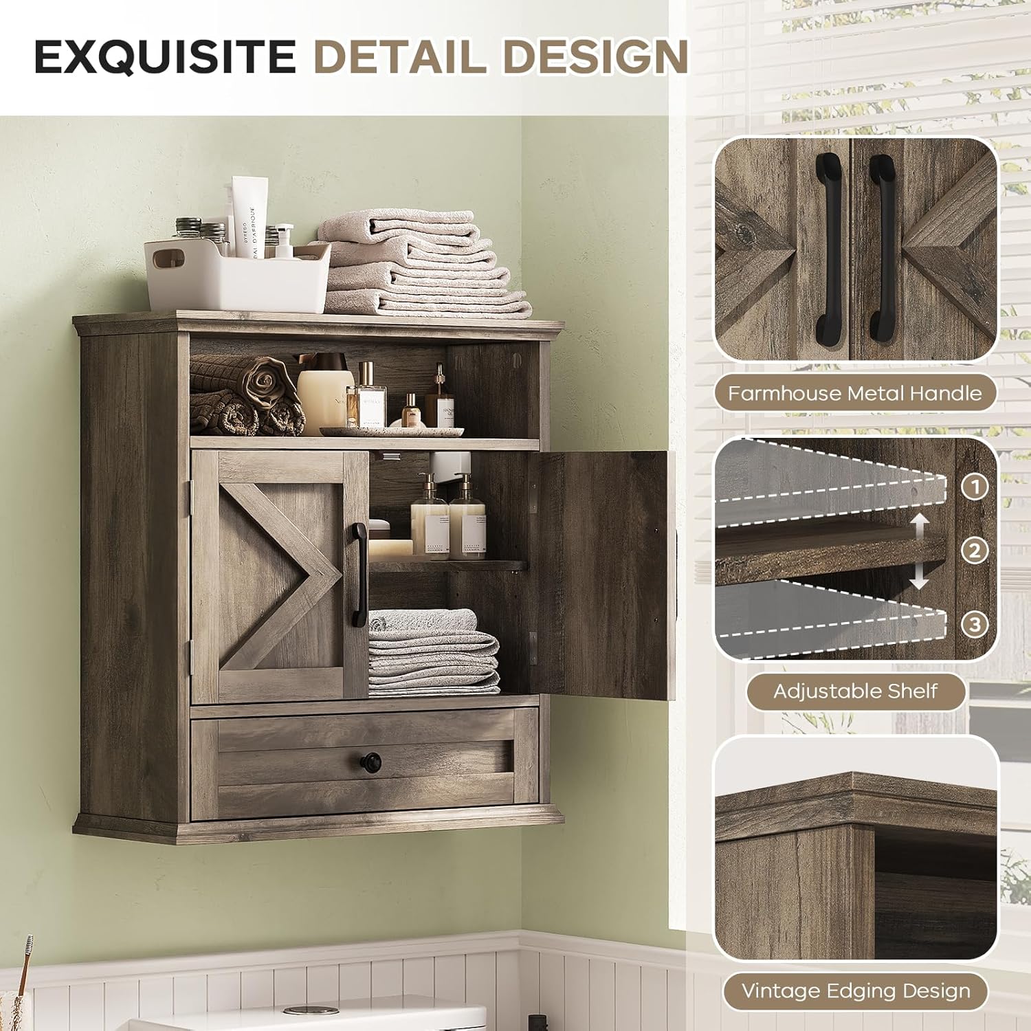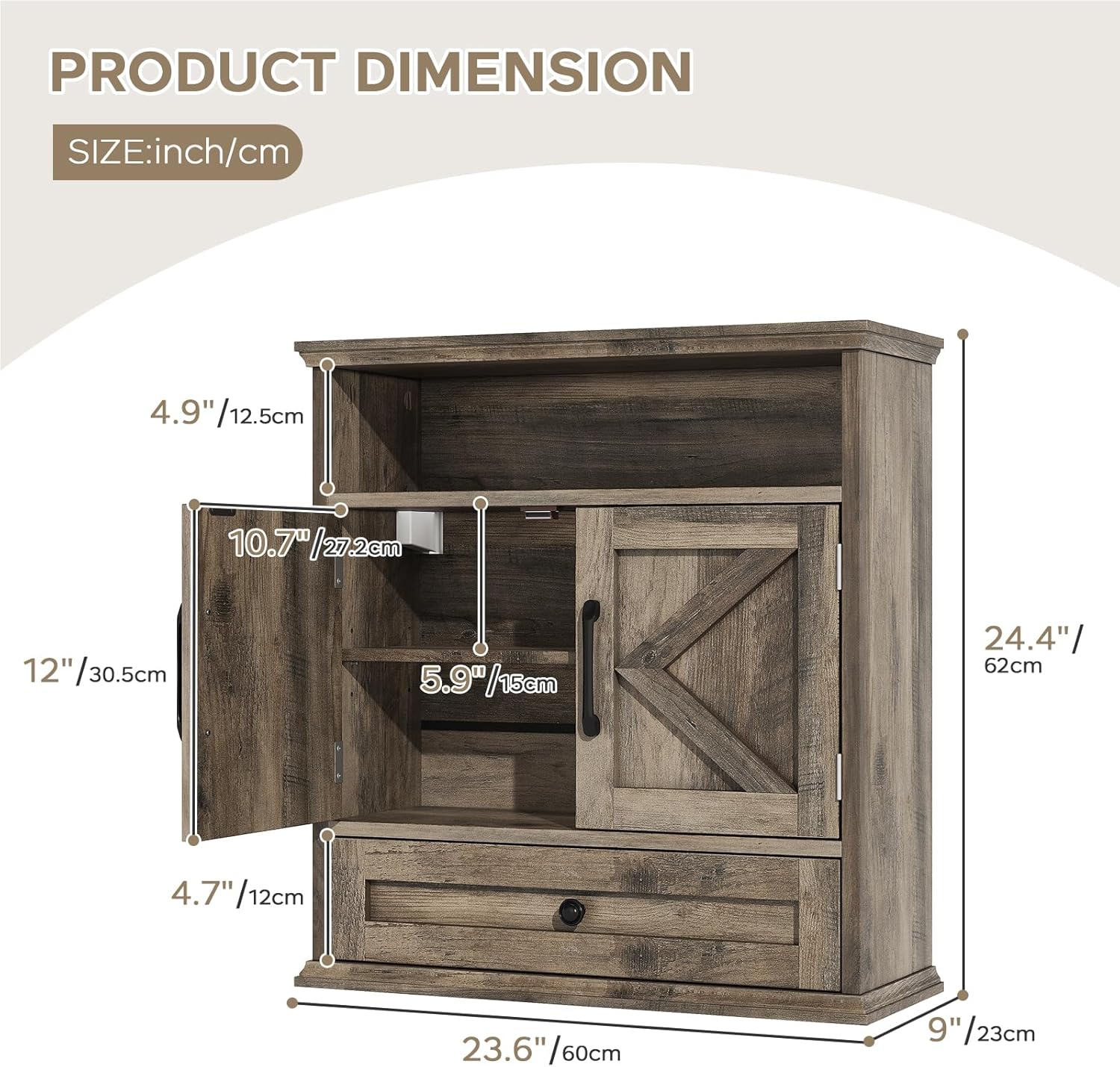 Bathroom Wall Cabinet, Wall Mounted Medicine Cabinet with Drawer, Barn Door & Adjustable Shelf, 24.4"H x 23.6"W x 9"D Grey Over Toilet Farmhouse Storage Cabinet for Kitchen, Laundry, Entryway