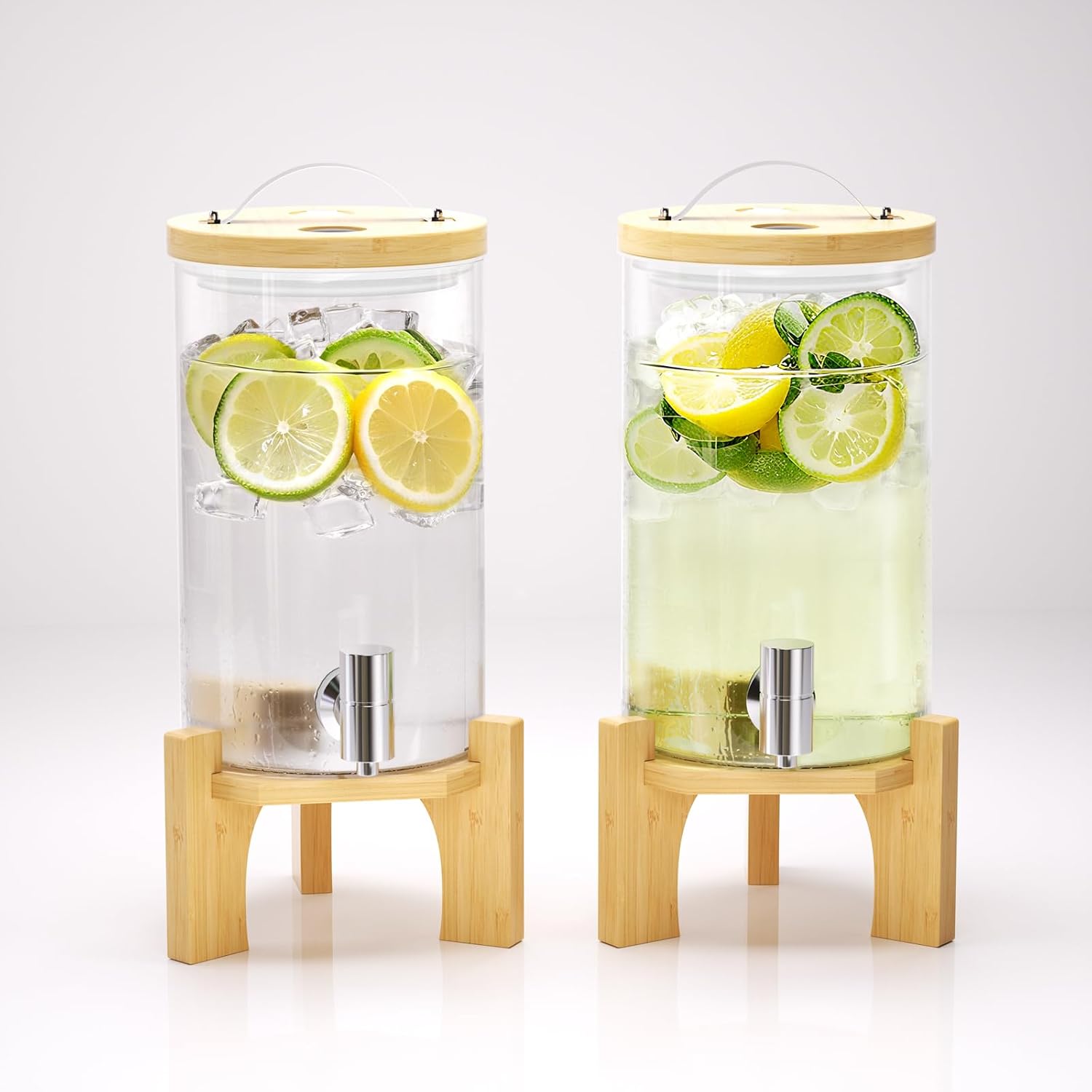 1.2 Gallon Glass Drink Dispenser For Parties, Beverage Dispenser With Bamboo Wood Stand And Stainless Steel Spigot, Countertop Water Dispenser, Lemonade Dispenser For Wedding, Picnic (2PACK)