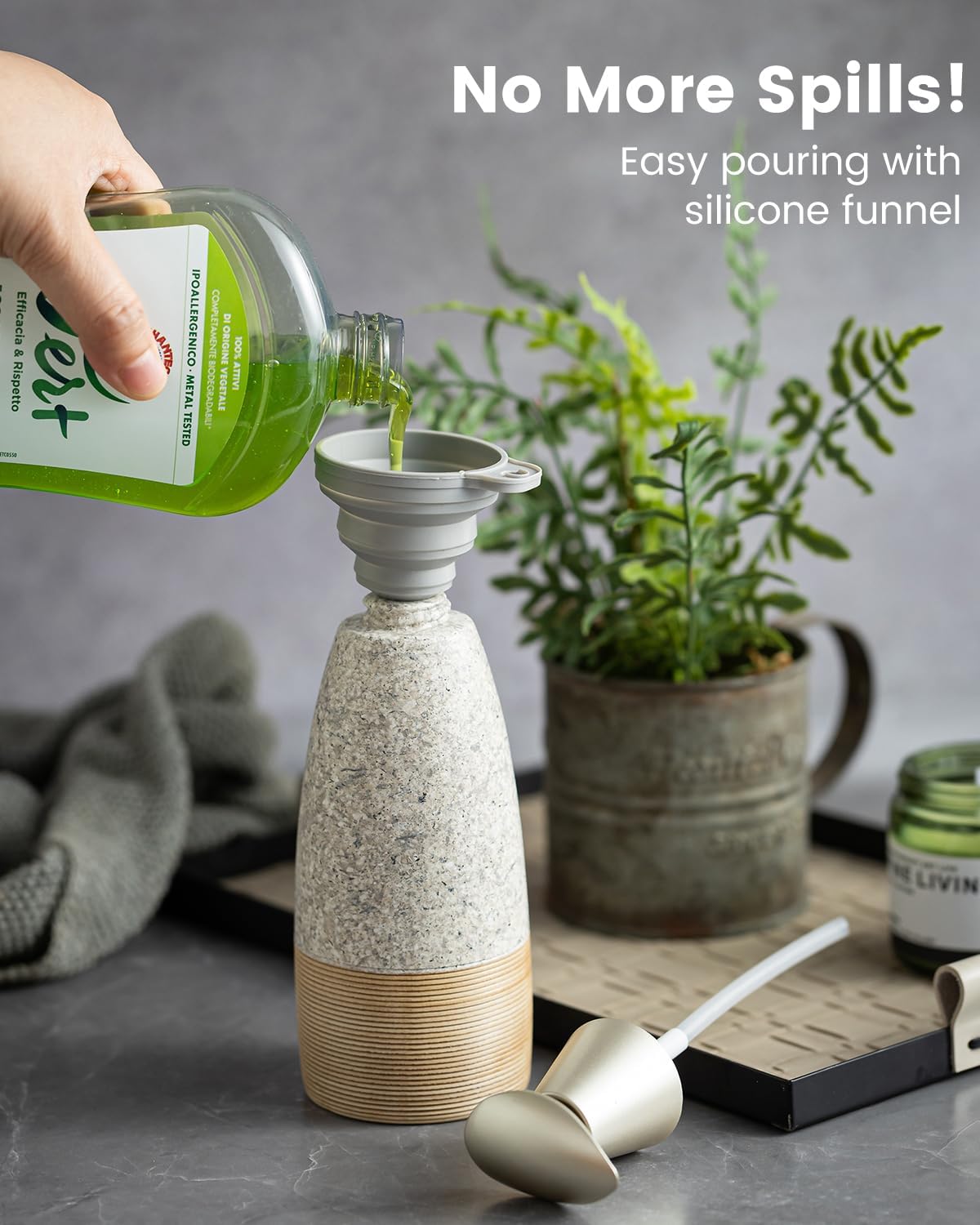 - Includes a Flexible Silicone Funnel: The dish soap dispenser for kitchen features a flexible silicone funnel, allowing for effortless, spill-free refills your liquids. Say goodbye to messy countertops and enjoy a clean, dry surface