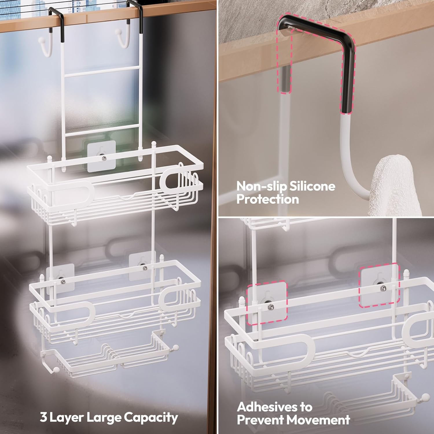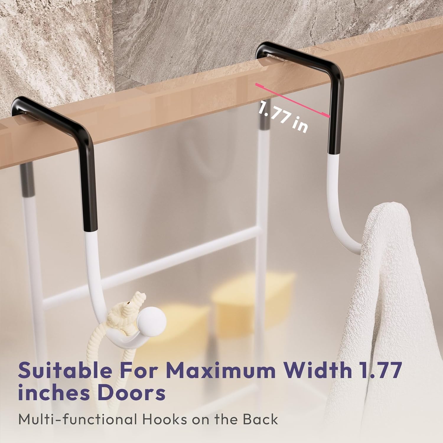 - [Dual Anti-Slip Design for Secure Fit]: This shower racks for inside shower features black anti-slip silicone on the top door hooks to protect and stabilize the rack, plus it comes with two adhesive pads for extra hold—just attach and go. Fits doors up to 1.77 inches thick without tools, delivering a safe, no-wobble experience in busy homes