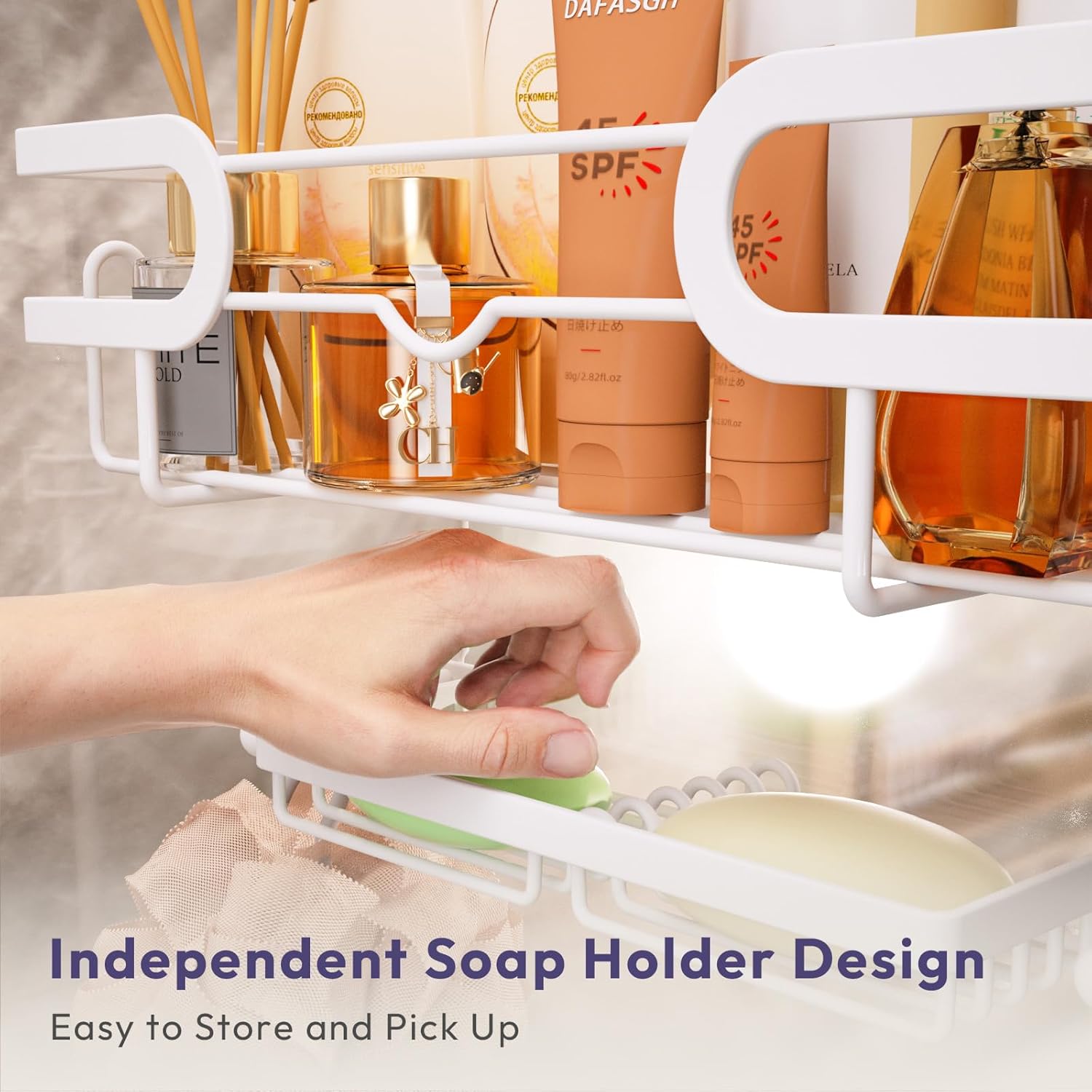 - [Convenient Hooks and Soap Tray]: Our bathroom shower organizer includes a built-in dual soap holder and multiple hooks for loofahs, washcloths, and brushes—ensuring all your shower accessories are within easy reach. A true game-changer for quick, comfortable, and efficient showers