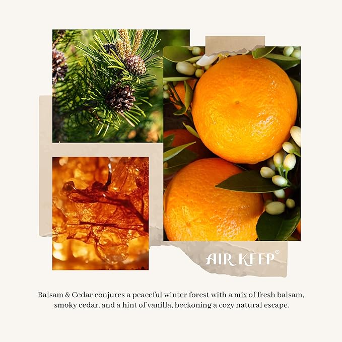 - Scent:Balsam & Cedar conjures a peaceful winter forest with a mix of fresh balsam, smoky cedar, and a hint of vanilla, beckoning a cozy natural escape.