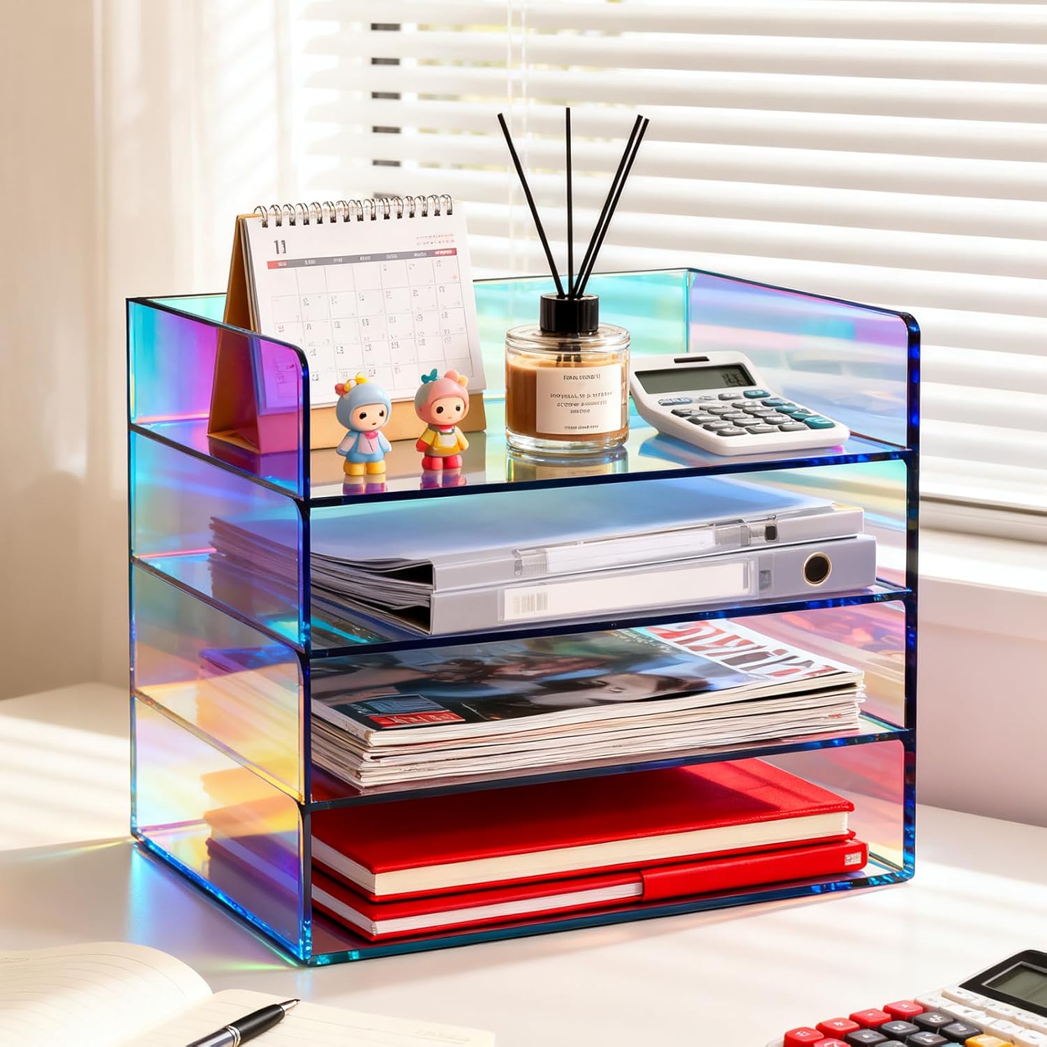 Gelite Acrylic File Organizer for Desk 4 Tiered Stackable Letter Tray Office Paper Storage Desktop Document Sorter, Iridescent