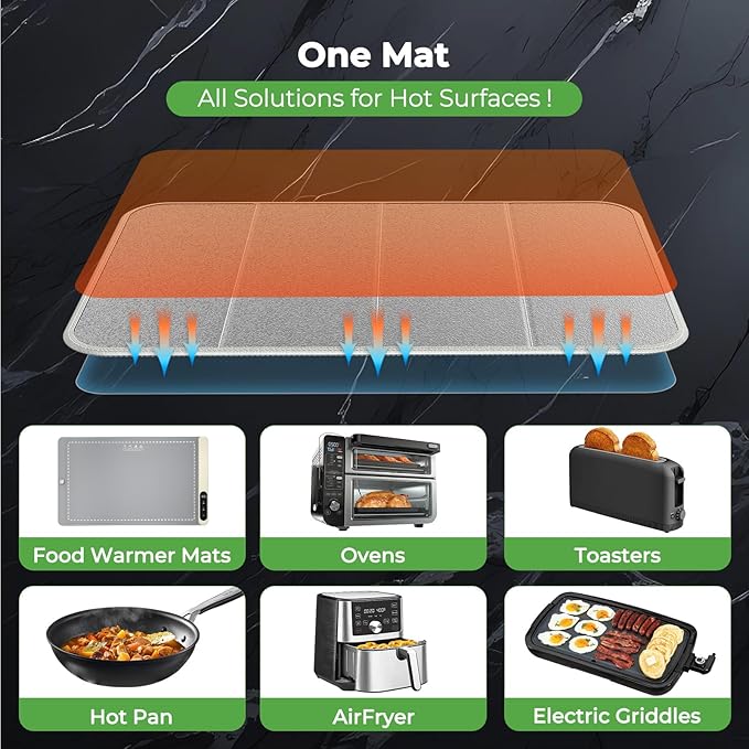 - Universal Size for Maximum Compatibility: The 23×15-inch dimensions fit most food warming mats on the market, creating a protective buffer against heat damage. Specifically shields heat-sensitive surfaces like marble, quartz, granite, solid wood, and glass from cracking or warping caused by high temperatures. (Note: Food warming mat not included.)