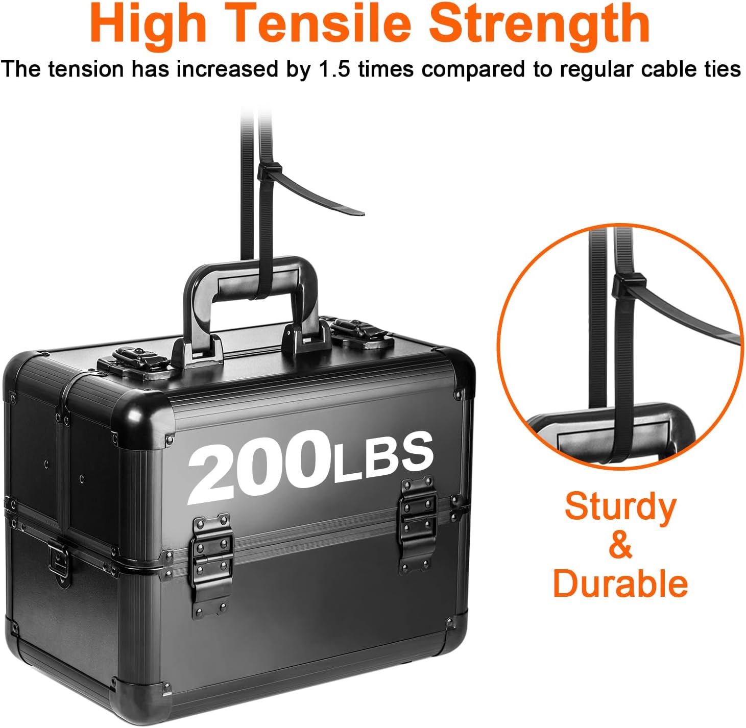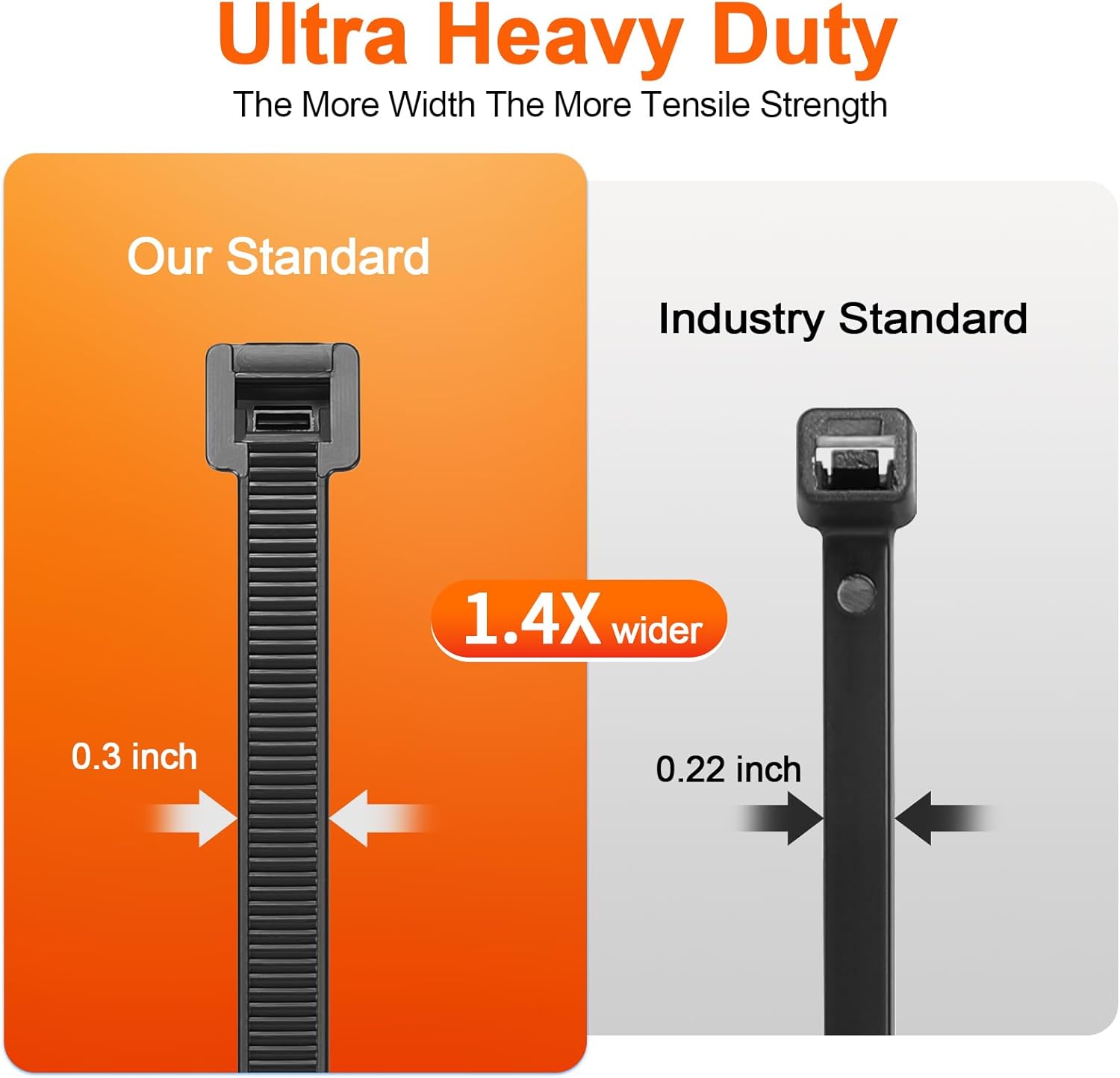 - 【200lb Tensile Strength】: The more width and Thickness, the more tensile strength. our zip ties 12 inch width is 0.3 inch(7.6mm), while industry standard is 0.19 inch(4.8mm), our zip ties 12 inch Thickness is 0.076" inch(1.95 mm), while industry standard is 0.055 inch(1.38mm),Our Double sided tooted heavy duty zip ties, provide 200 lbs tensile strength.