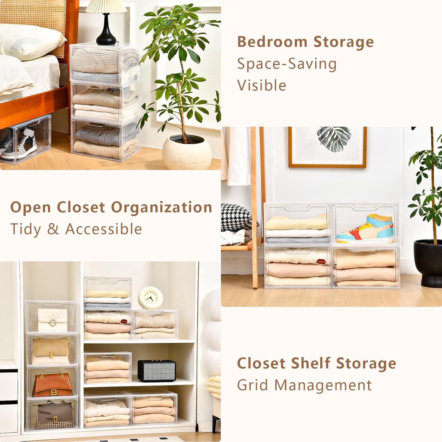 - Versatile Size & Multi-Pack:With dimensions of 13" x 10.63" x 8.3" and a convenient set of 8, these closet organizers adapt to diverse storage needs. Ideal as closet drawers for clothing or clear storage bins for accessories and small items. They help maintain a clutter-free and systematized space in any room.