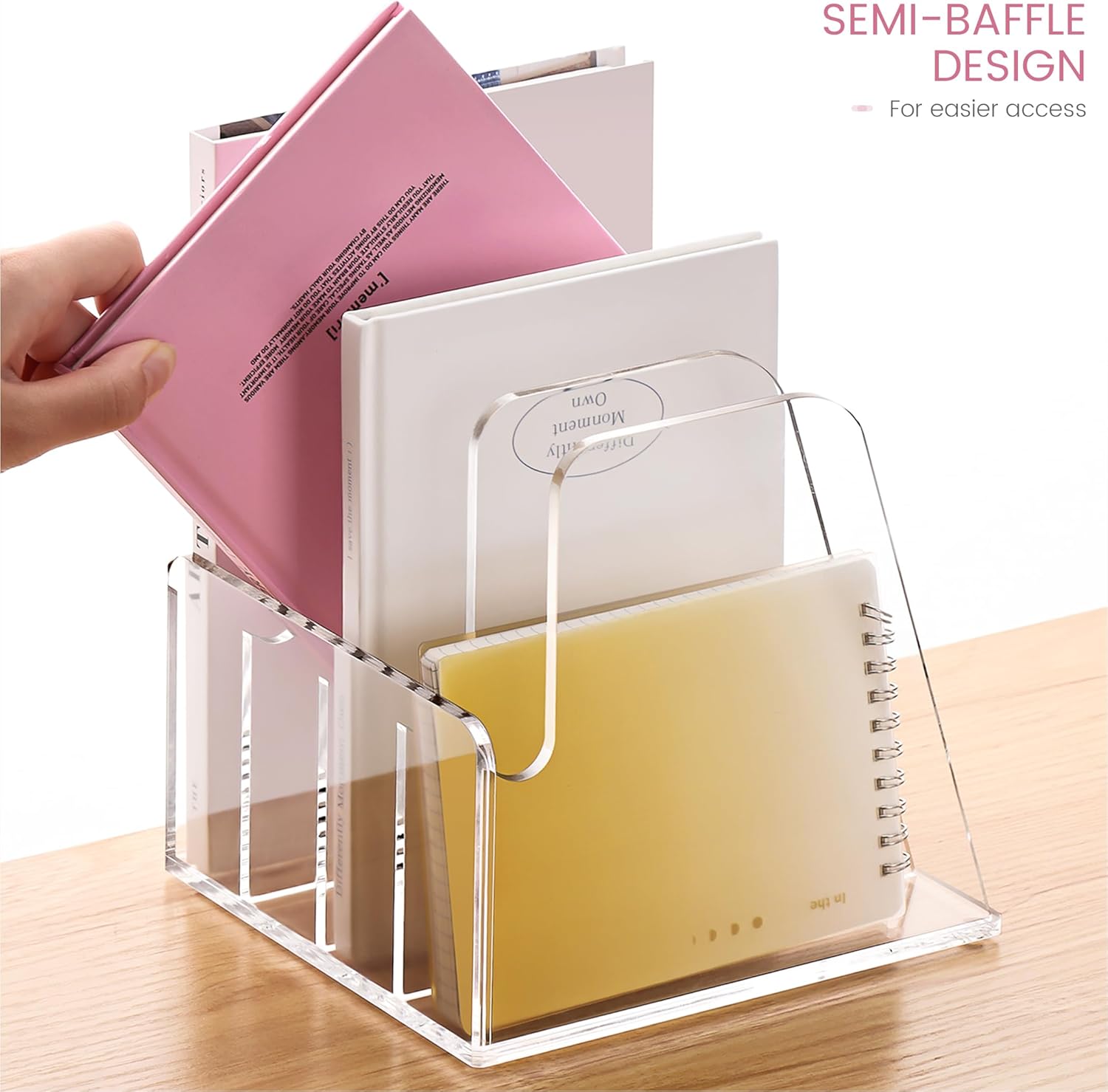 - Compact Vertical File Holder:YUXUN 4-compartment acrylic magazine file holder is designed for desk storage. Perfect for storing notebooks, manuals, paperbacks, comic books, coloring books,magazines, bills and reports, this book organizer for desk helps to categorize and avoid clutter. Ideal for home offices, kid's rooms, classrooms, offices, reading rooms, coffee shops and more