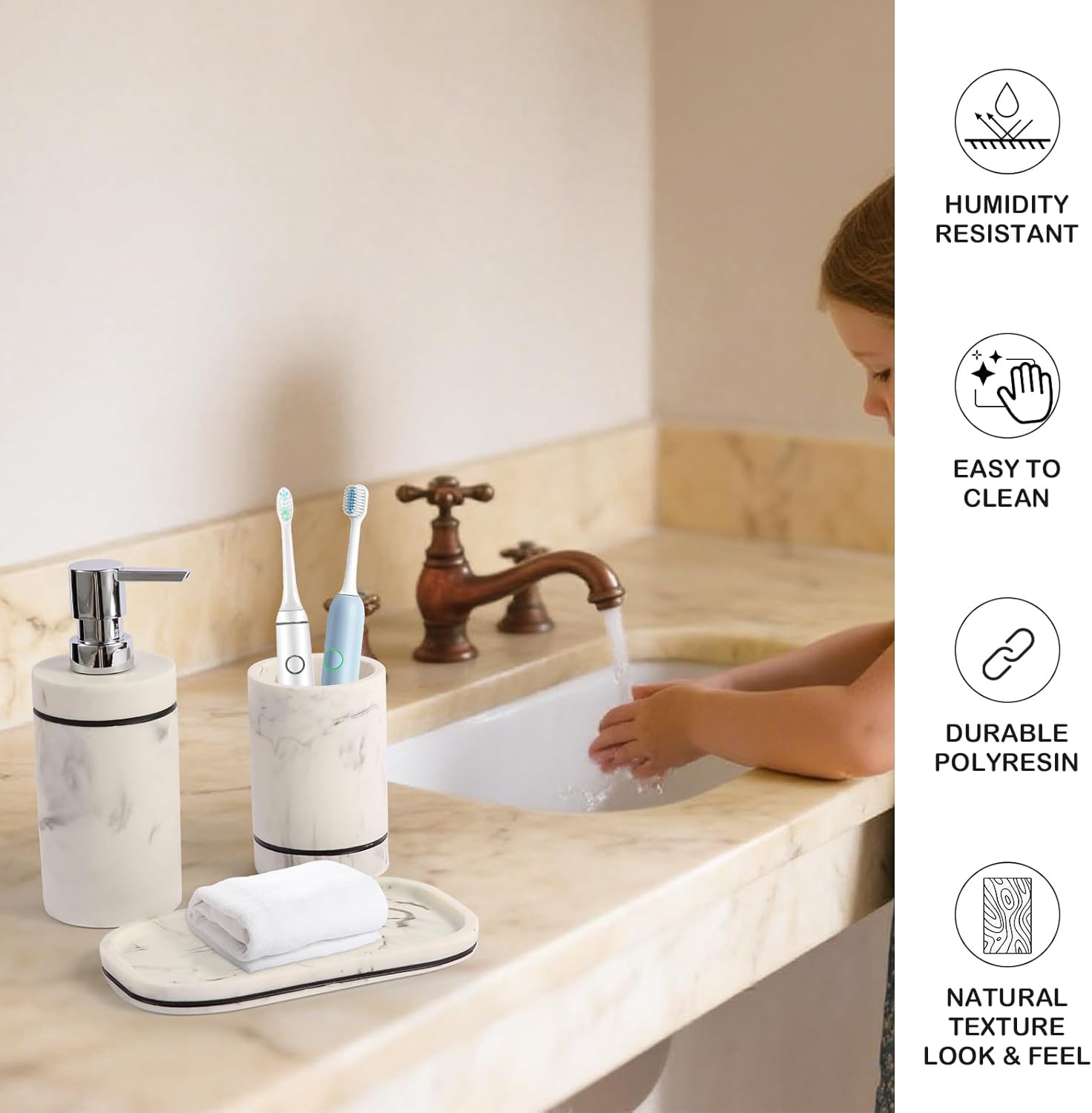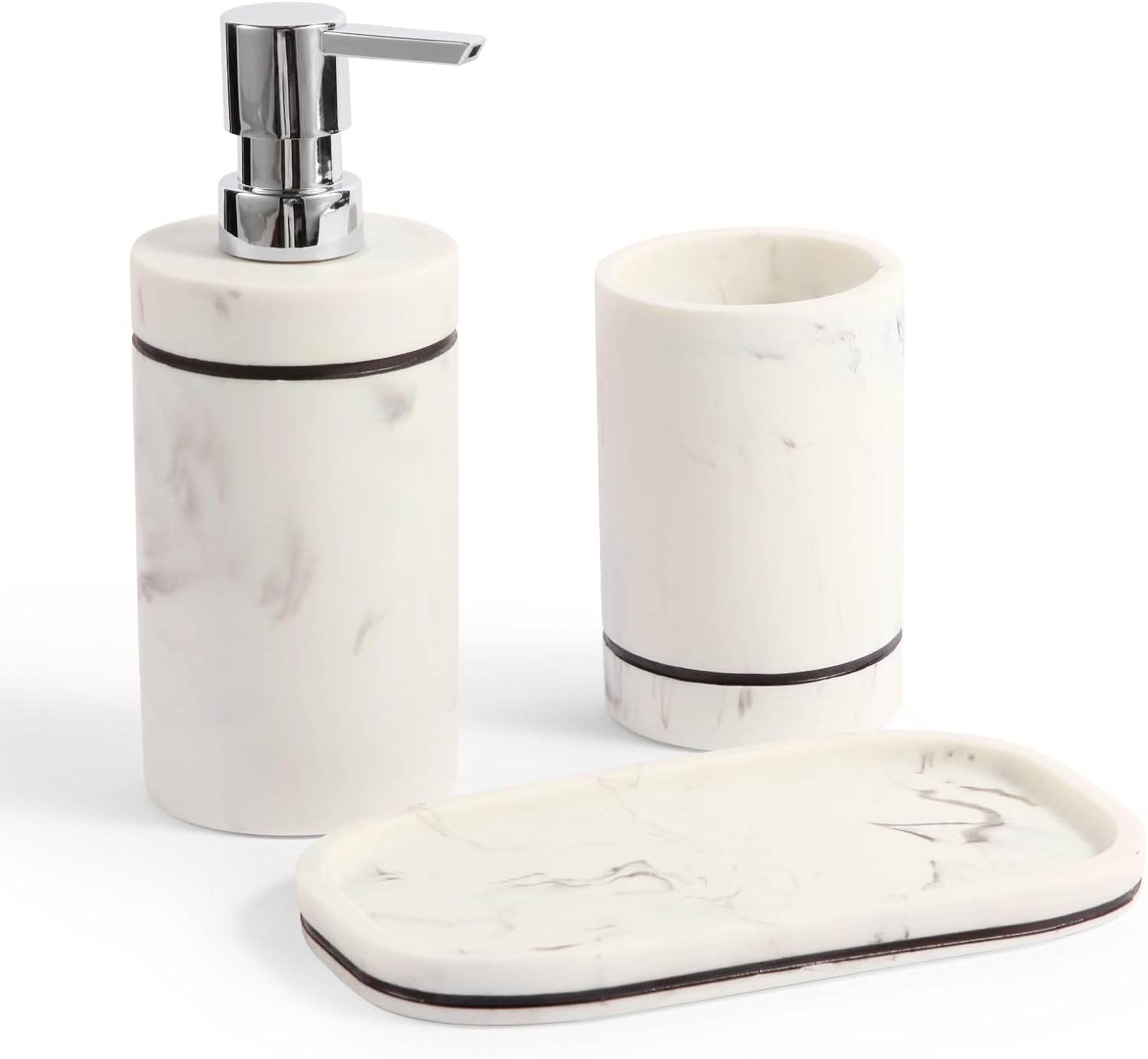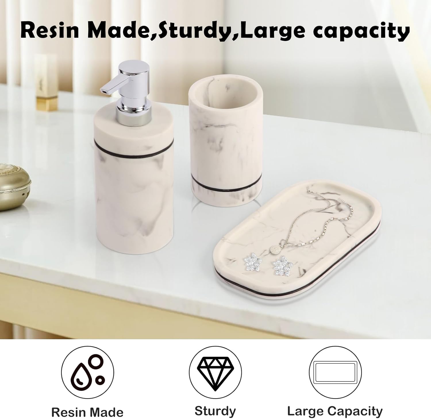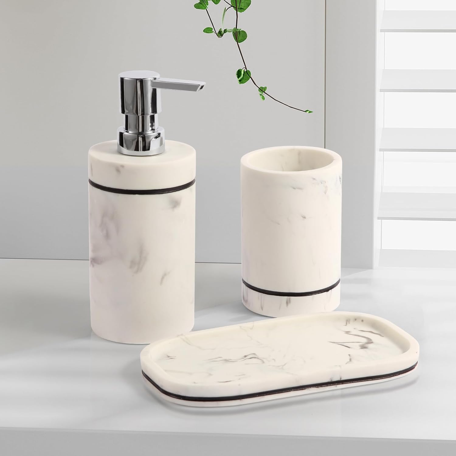 Marble Pattern Bathroom Accessory Set,3 Pieces Resin Bathroom Accessories Set - Lotion Dispenser,Toothbrush Cup,Vanity Tray(Marble White)