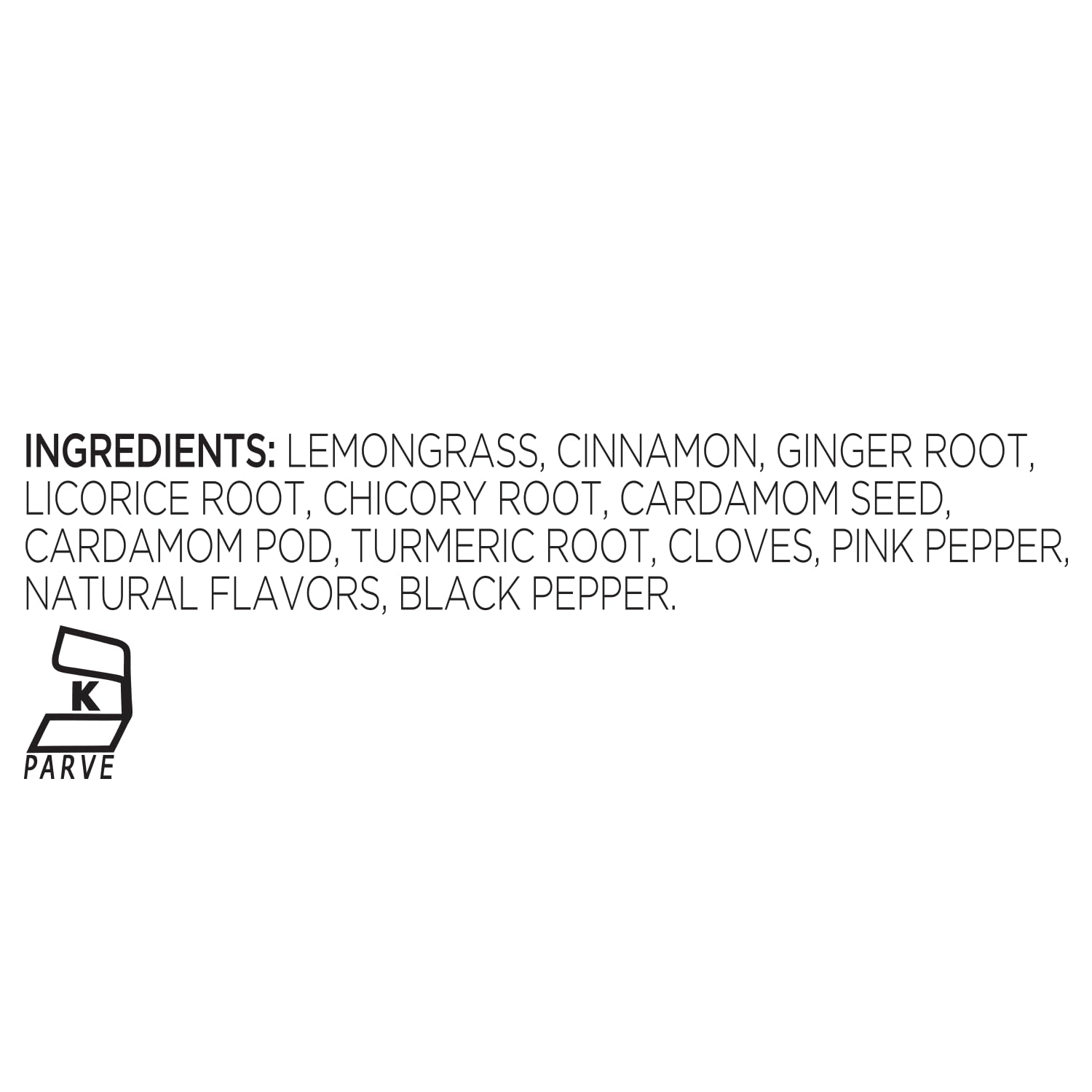 - INGREDIENTS - Lemongrass, Cinnamon, Ginger root, Licorice root, Chicory root, Cardamom seed, Cardamom pod, Turmeric root, Cloves, Pink pepper, Natural Flavors, Black pepper.