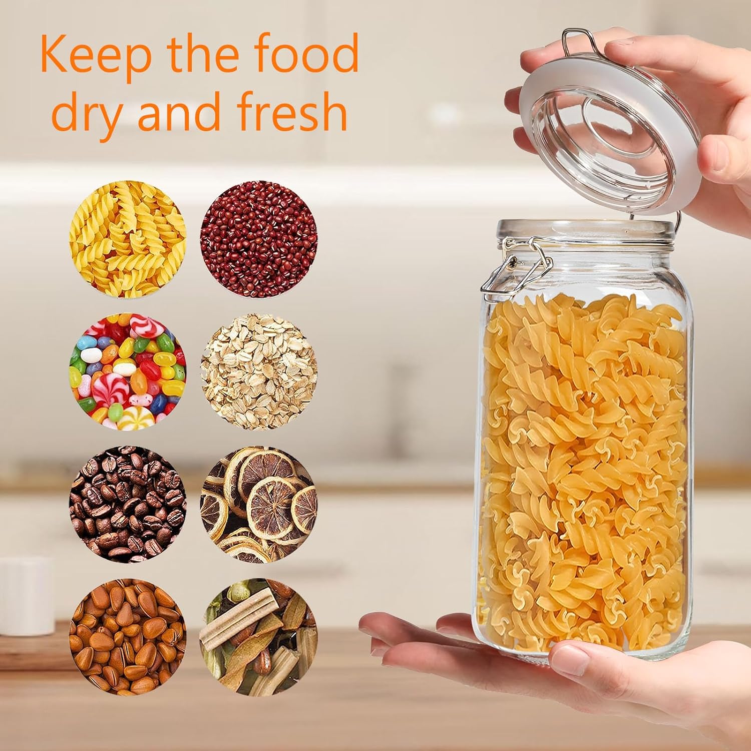 - 2.Airtight Seal Lids — Glass jars with airtight lid is made of food-graded glass; Each kitchen canisters for countertop is well sealed, equipped with silicone gasket and a stainless iron locking clamp to make sure your food stay clean and fresh in storage