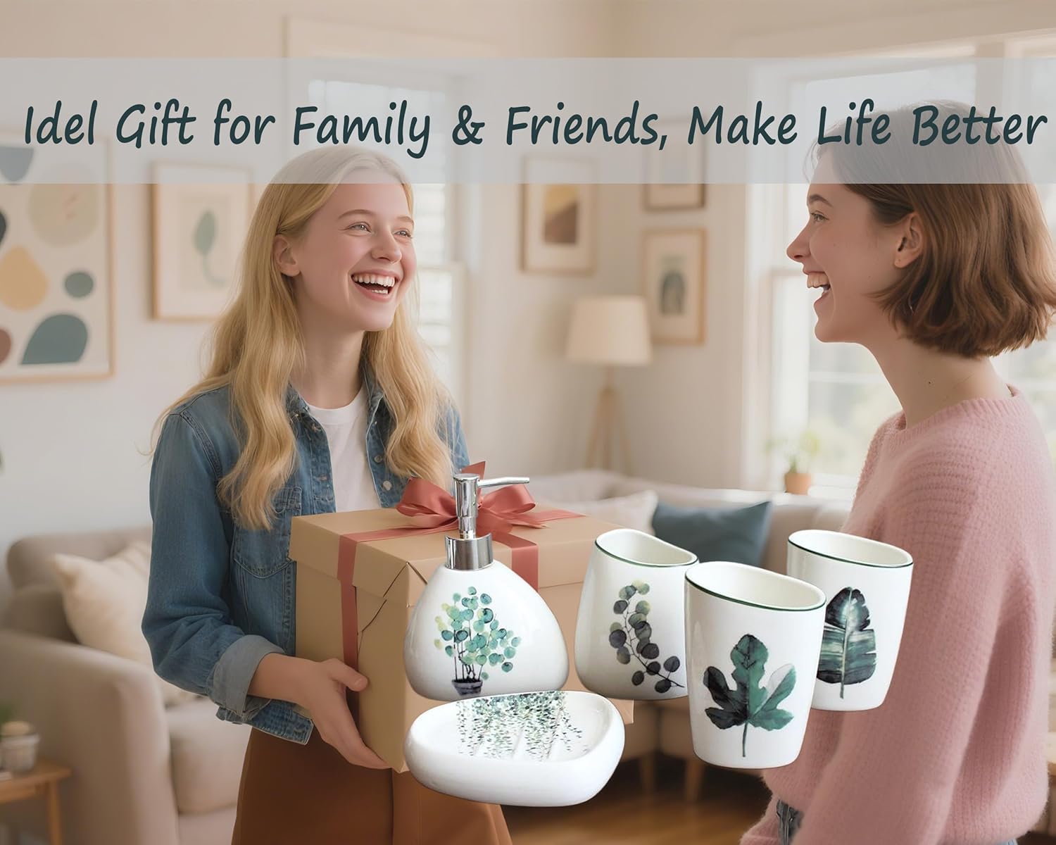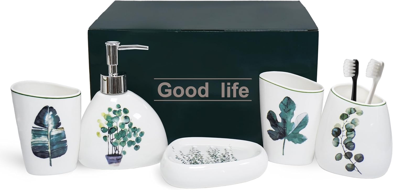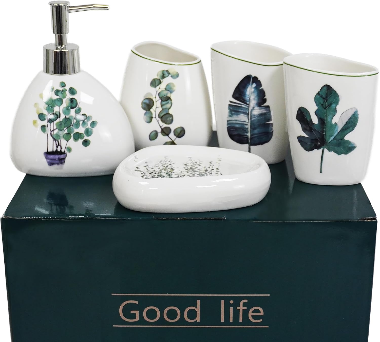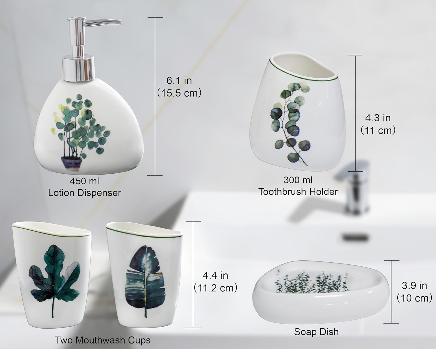 5 Piece Ceramic Bathroom Accessory Set with Botanical Pattern, Includes Soap Dispenser, Toothbrush Holder, Soap Dish & 2 Mouthwash Cups, Modern Elegant Countertop Decor for Bathroom Vanity