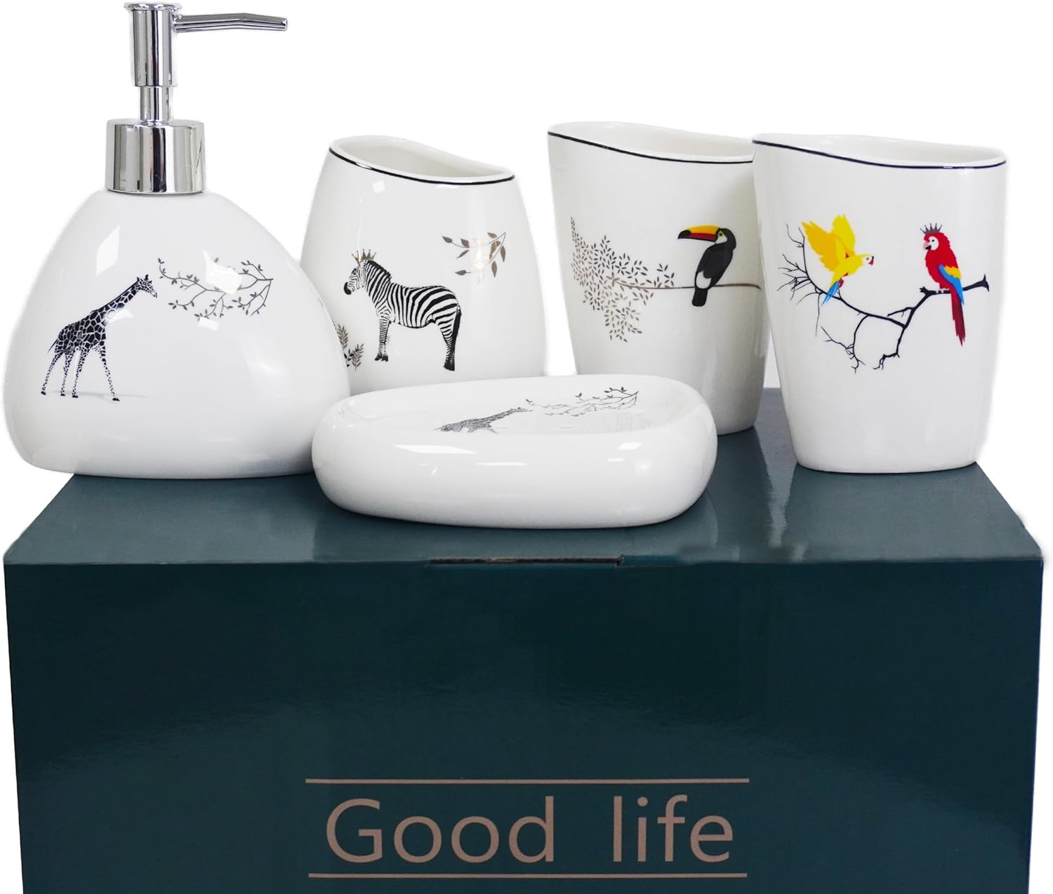 5 Piece Ceramic Bathroom Accessory Set with Animal Pattern, Includes Soap Dispenser, Toothbrush Holder, Soap Dish & 2 Mouthwash Cups, Modern Elegant Countertop Decor for Bathroom Vanity