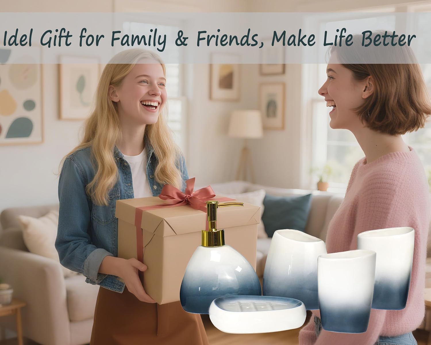 5 Piece Ceramic Bathroom Accessory Set in Ombre Blue, Includes Soap Dispenser, Toothbrush Holder, Soap Dish & 2 Mouthwash Cups, Modern Elegant Countertop Decor for Bathroom Vanity