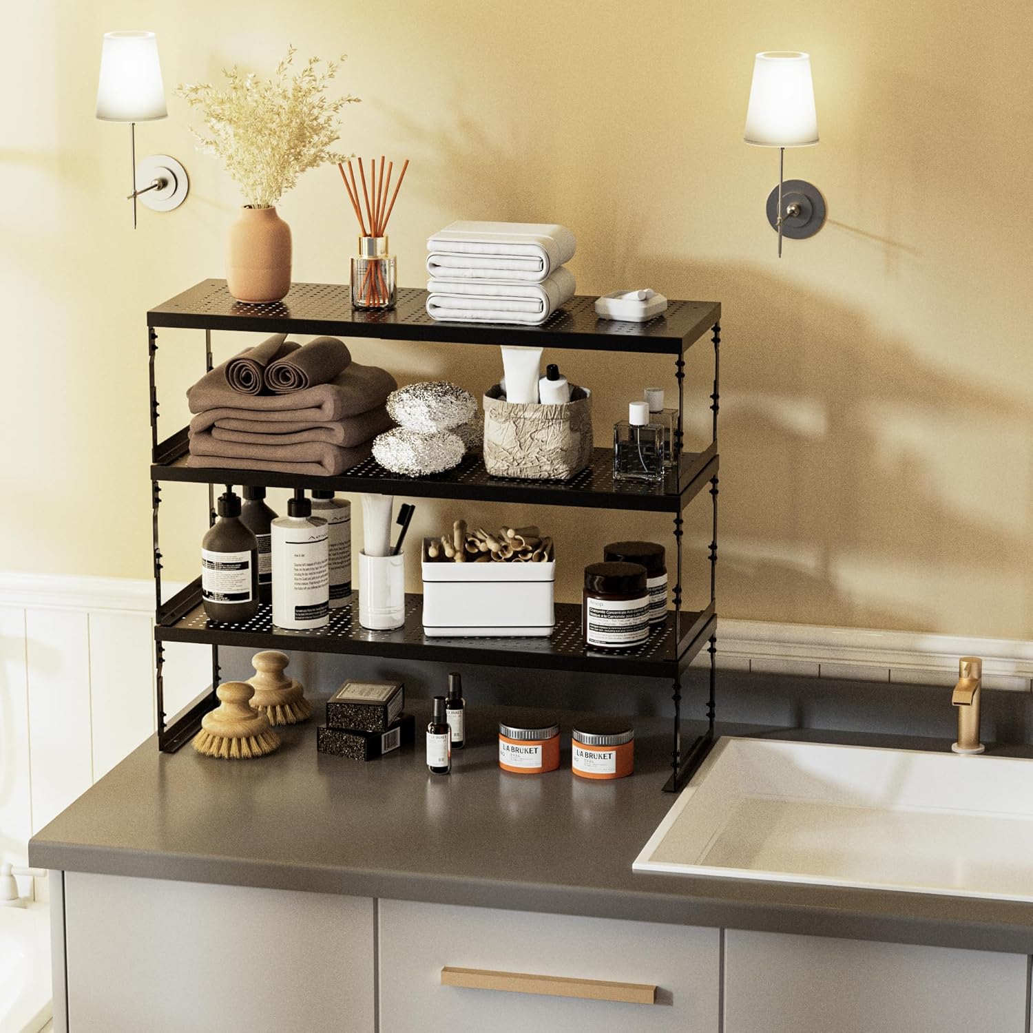 - Stackable & Expandable Flexibility: This metal shelf features an adjustable height ranging from 6.7 inches to 8.6 inches and a width that can be extended from 15.95 inches to 27.2 inches. This adaptability allows it to fit perfectly into various spaces. Moreover, multiple units can be stacked vertically, significantly increasing your storage capacity and making the most of available room.
