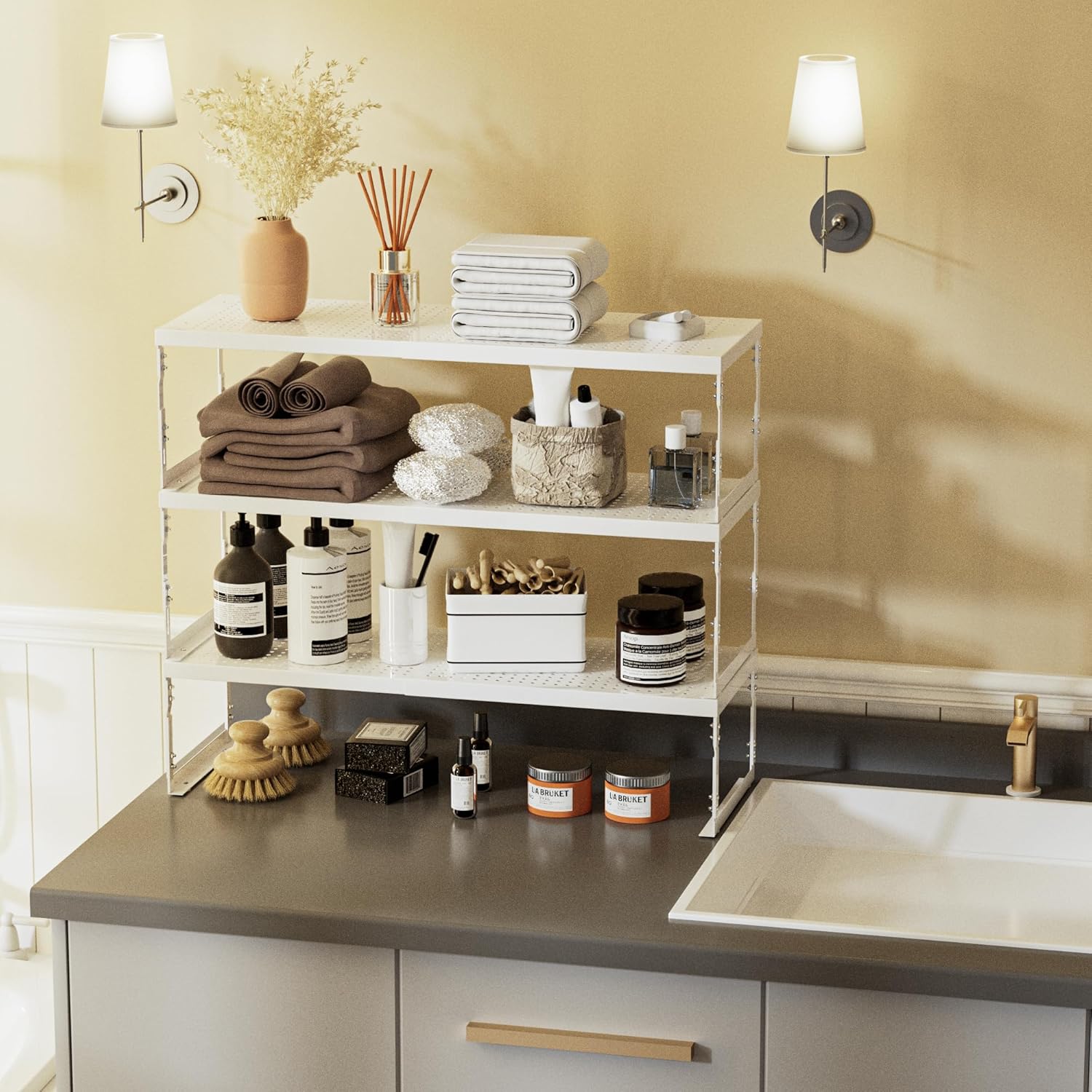 Adjustable Stackable Metal Storage Shelf Organizer - Expandable Wire Rack with Perforations for Kitchen, Pantry, Bathroom, Cabinet & Office-Compact, Durable & Sturdy (1PACK/Large/White)