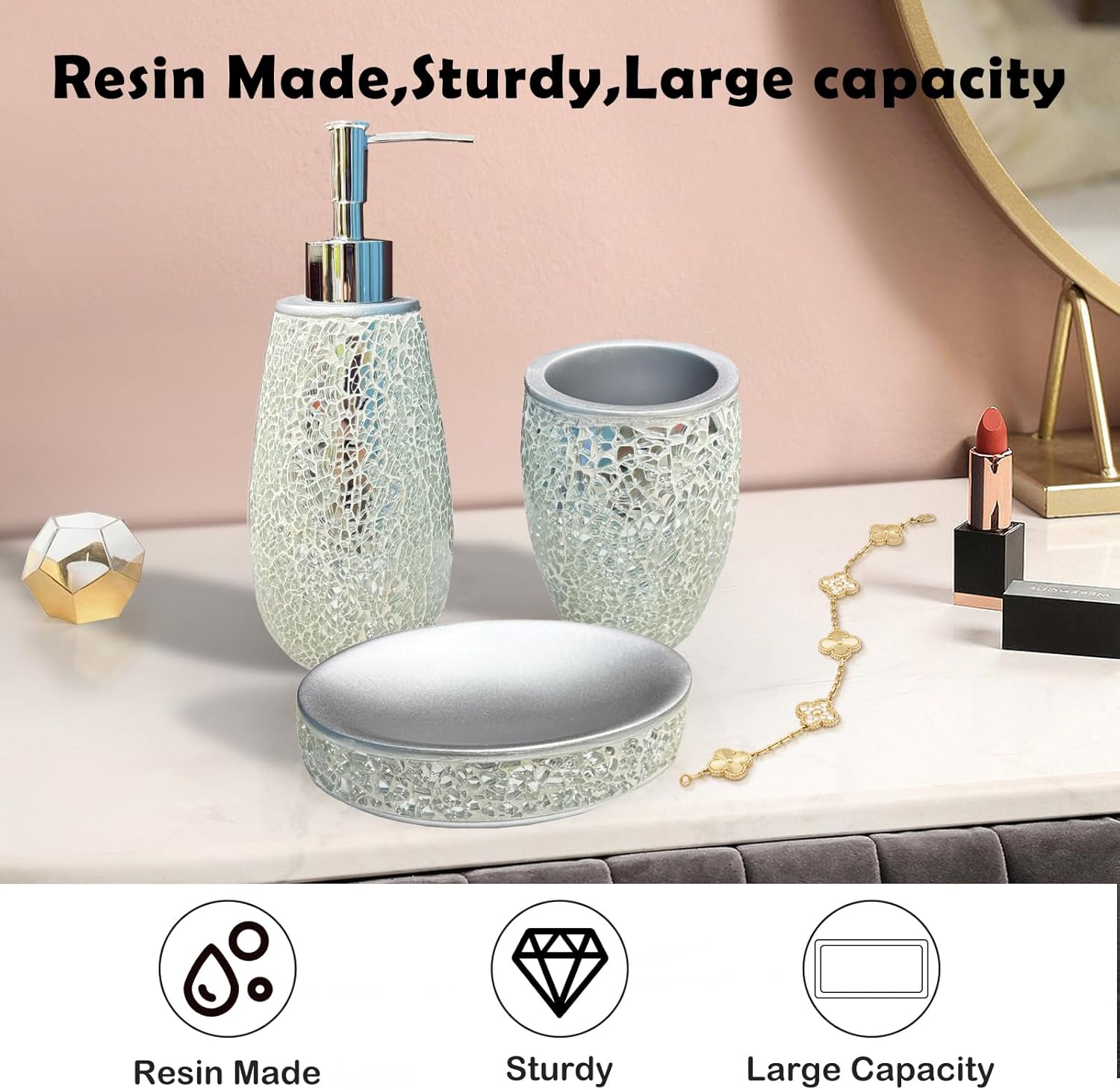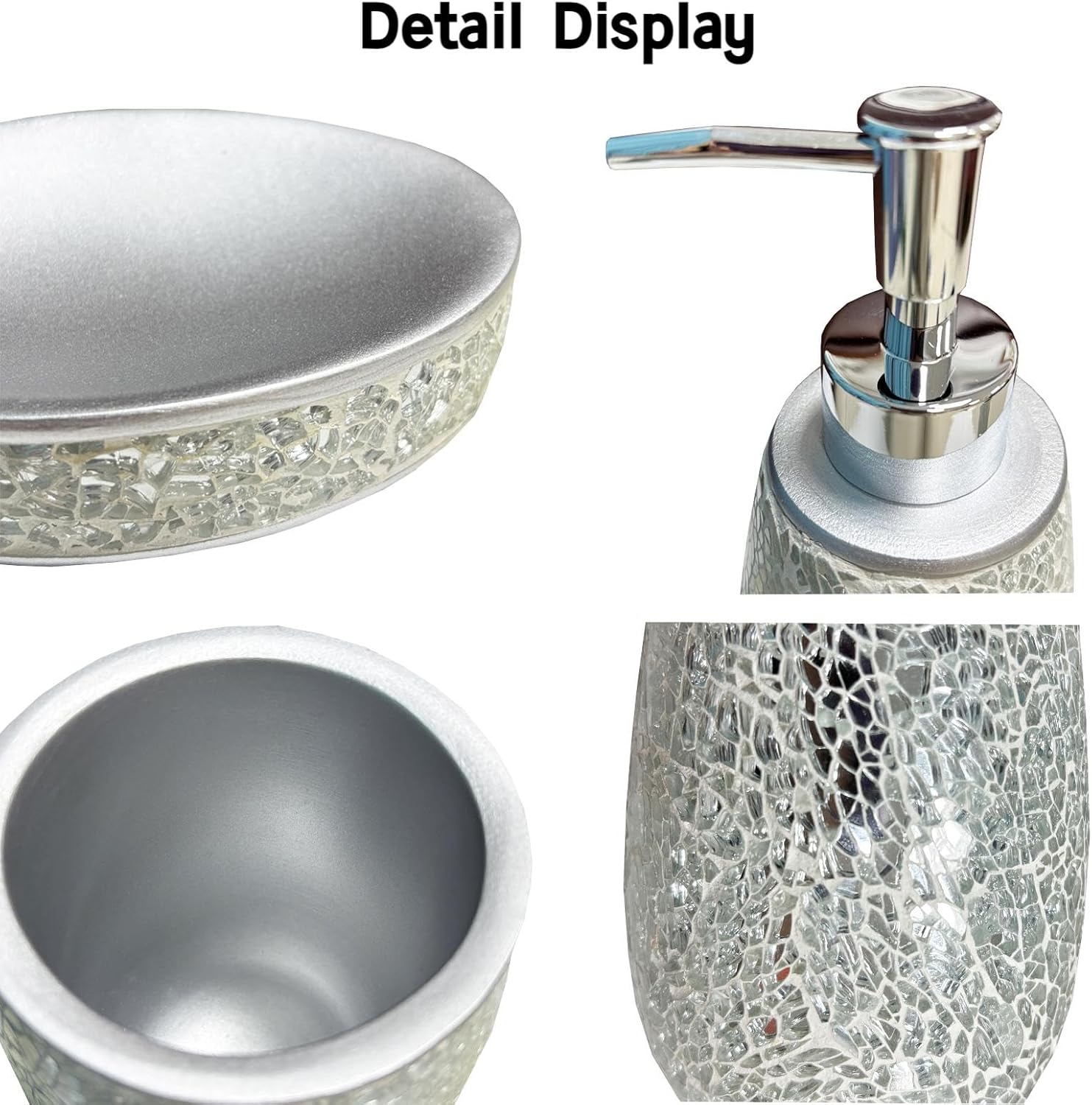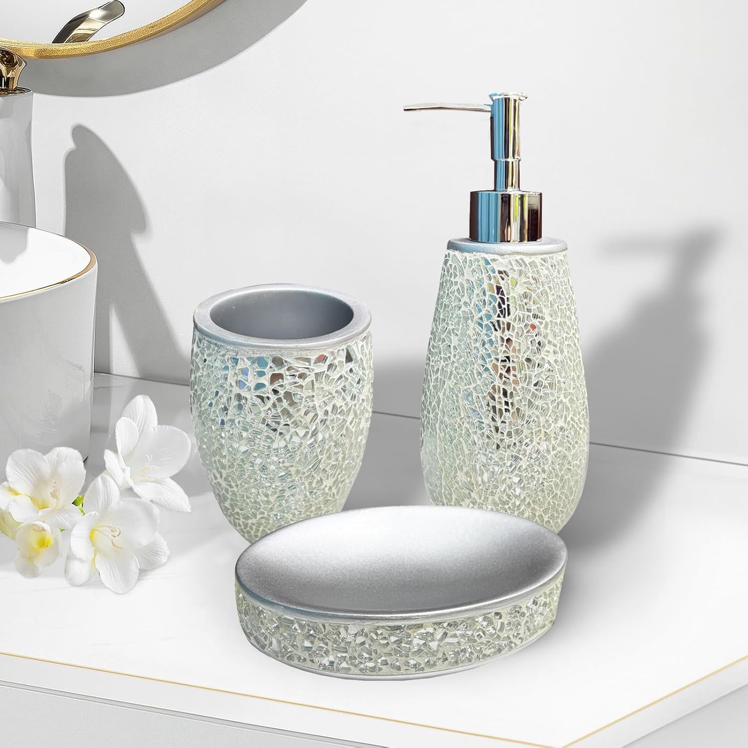 - Glass Sequins Bathroom Set: Modern luxury bathroom decor can be matched with any room such as master bedroom, guest room, dressing table, adding high-grade elegance and charm.