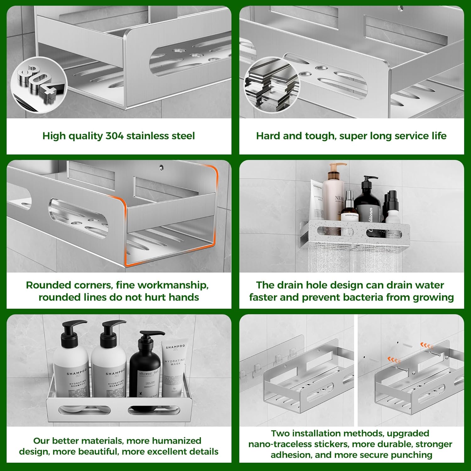 - 【Shower Shelves Advantages]Bathroom caddy are made of thickened 1.5mm thick industrial-grade high-quality 304 stainless steel,which will never rust,is durable and has excellent texture!It adopts artificial sanding and polishing,making the product smoother,more advanced and textured,and preventing cutting hands.Using advanced laser welding technology,the details are processed more smoothly and perfectly.Compared with other drawing and pressing molding,the product will have a quality improvement