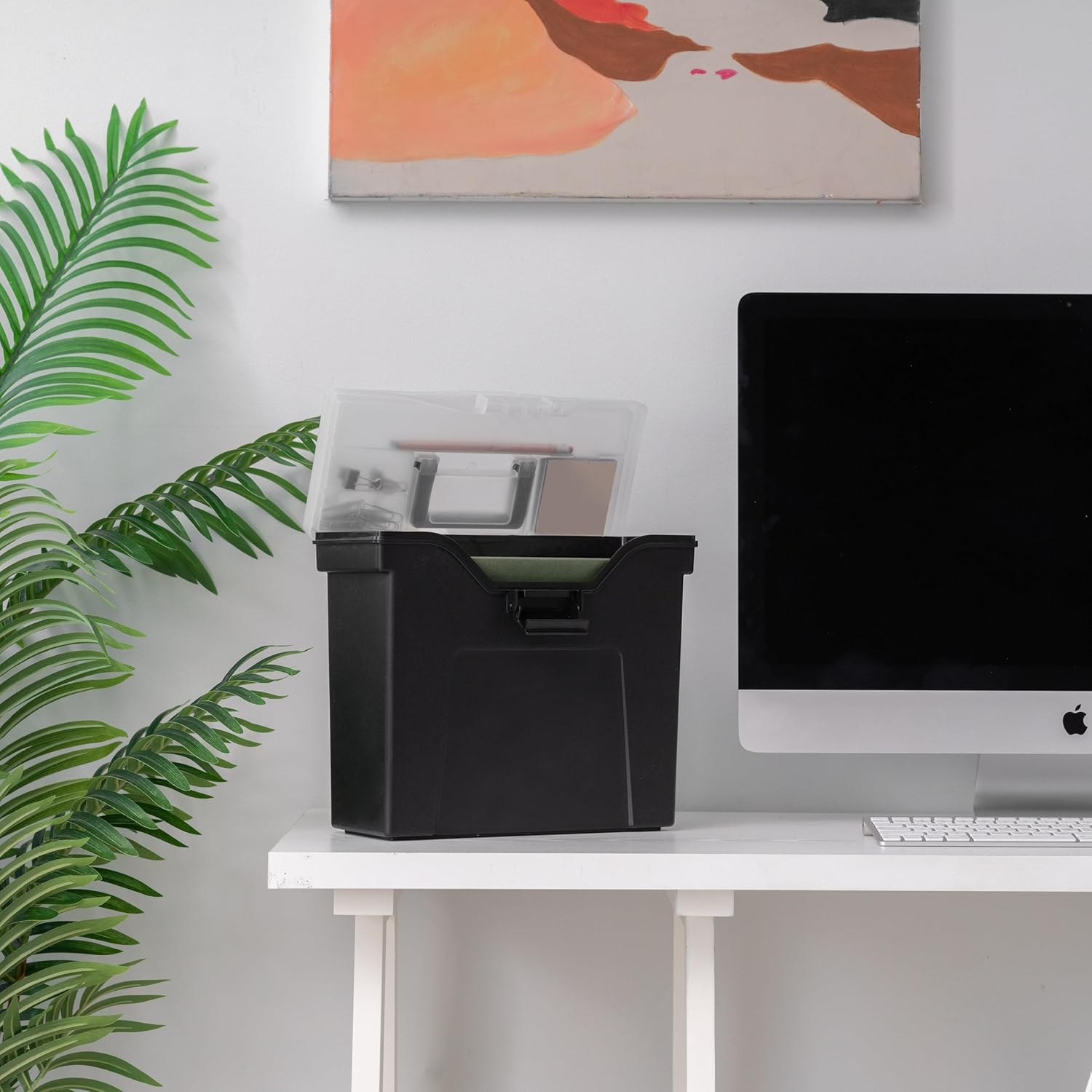 IRIS USA Portable File Box With Handle, Slim w/Organizer Lid, Plastic File Organizer Box for Letter Files, Hanging Filing Folder Organizer, Lockable, Secure Buckle, Black