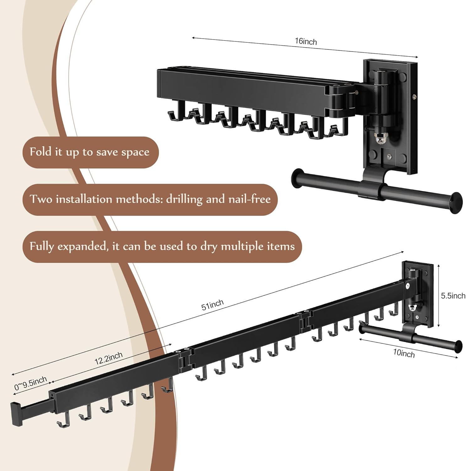 Wall Mounted Collapsible Clothes Drying Rack, Space-Saving Laundry Drying Rack Clothing Hanger, Durable Foldable Design Extends Left, Right & Up for Upgraded Versatility