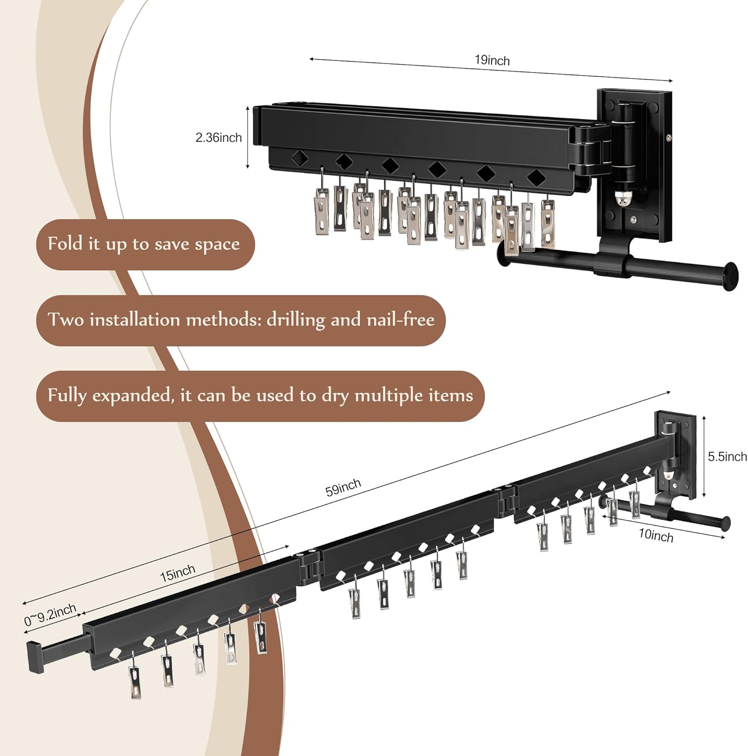 - Windproof Design with Clips & Holes: Equipped with 18 windproof holes and 15 clips, this upgraded wall mounted clothes drying rack keeps clothes, socks, and small items secure even on windy days, making laundry more convenient.