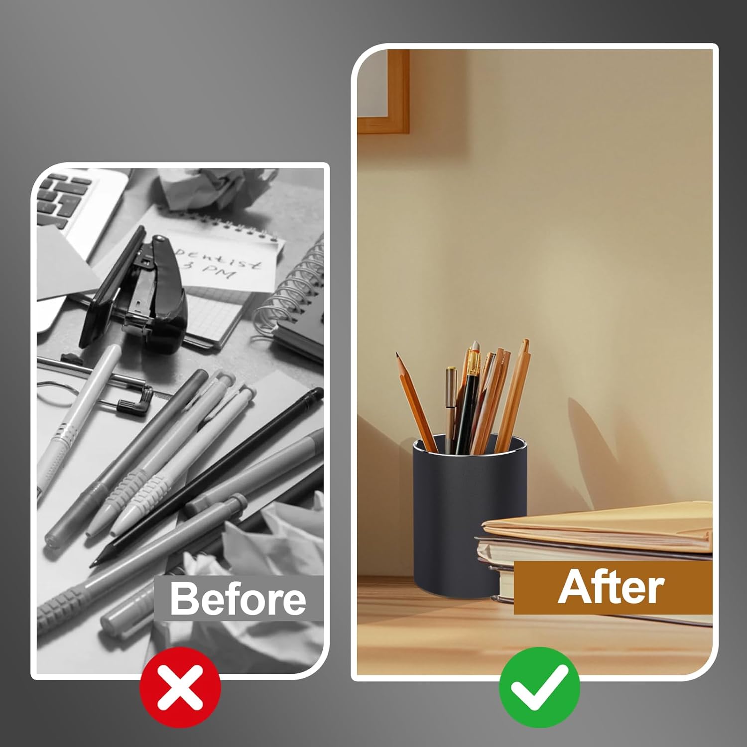 - 【 MULTI-FUNCTIONAL PEN CUP TO DECLUTTER ANY DESK】In the classroom, it’s a helpful tool to declutter your desktop such as pens, pencils, highlighters, rulers and other school stationary supplies. At bathroom, you can put toothbrush and toothpaste into the pretty pen holder. At bedroom, you can also organize all kinds of makeup tools on the dressing table. With our solid waterproof pen holder, you can easily declutter any desk!