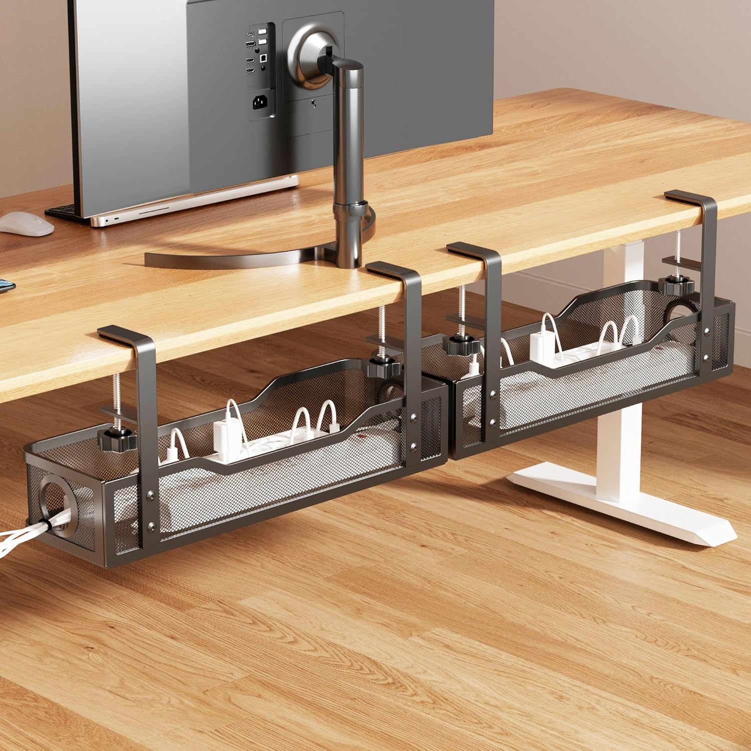 - No Need to Drill Holes - Instead of damaging your desk, our under desk cable management tray can be hung directly onto desk frames and adjust the position as easily as you like, unlike other screw installations.The wire management, following thorough welding and powder coating, offers resistance to rust and dust accumulation, ensuring dependable long-term use under the desk.