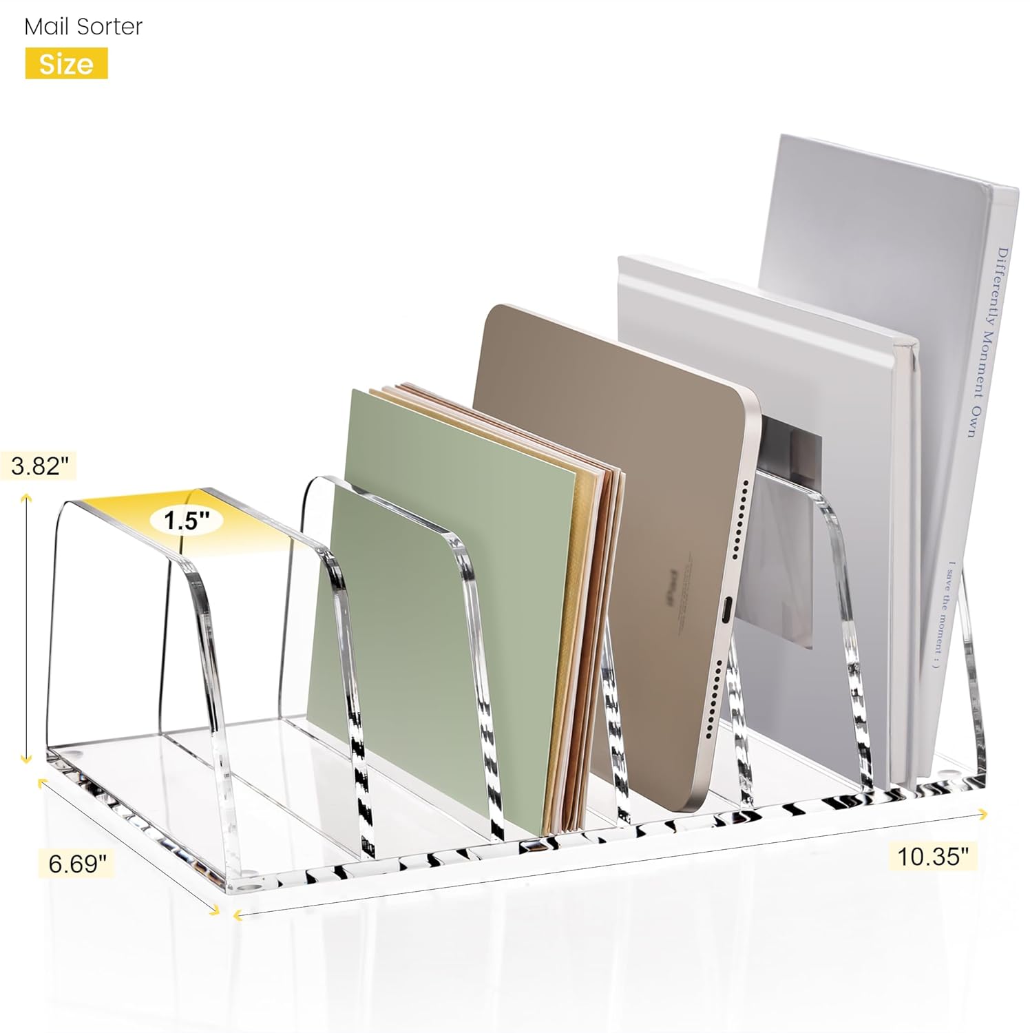 - CLEAR MAIL SORTER:Dimensions: 10.35" L x 6.69" W x 3.82" H, with 1.5" between each compartment. The entire desktop organizer is transparent, allowing clear visibility of books and easy retrieval. Made of crystal-clear acrylic, this vertical desk organizer fits any decor style and adds a touch of elegance to your workspace