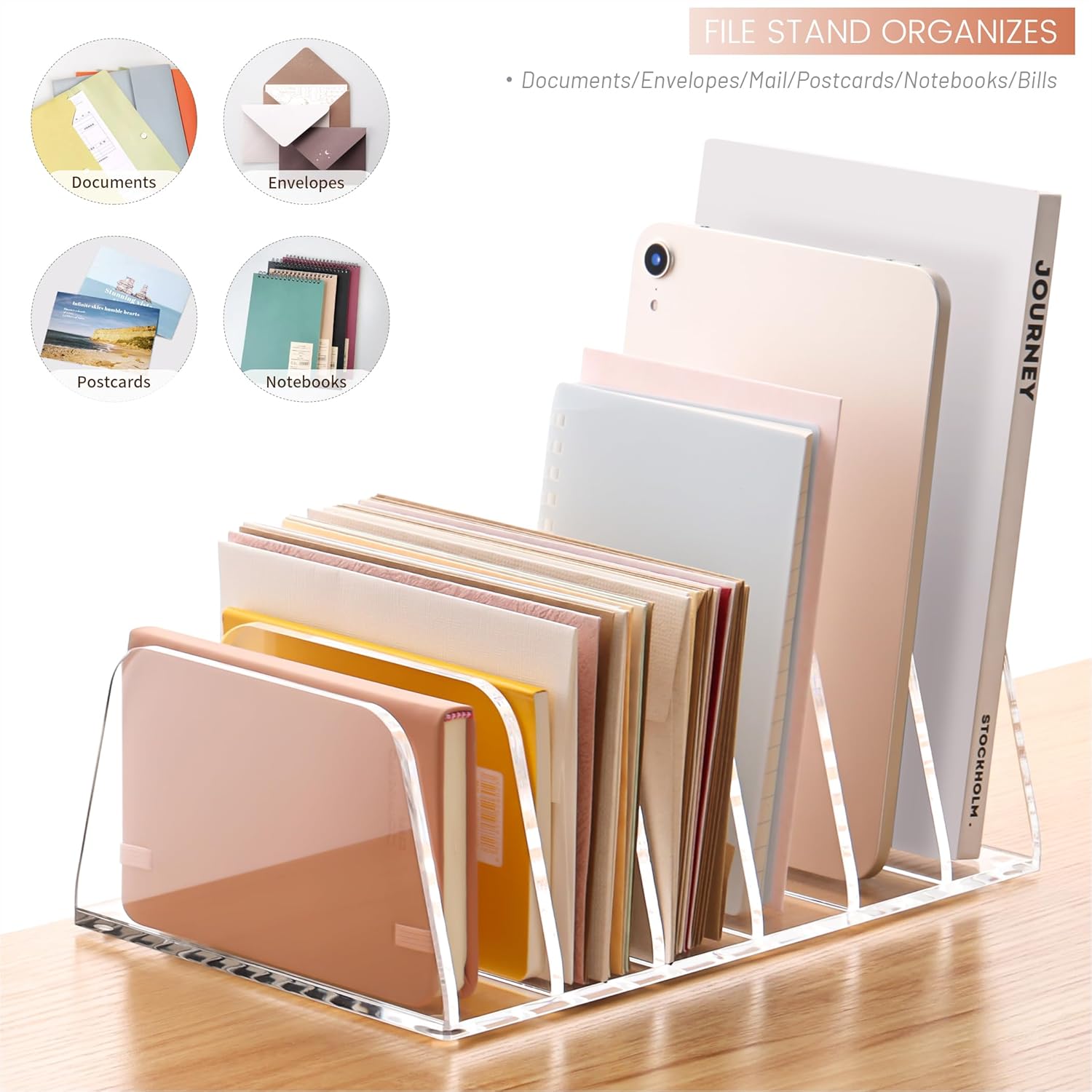 - MULTI-FUNCTIONAL FILE ORGANIZER:YUXUN 6-section acrylic file organizer is designed to keep your workspace neat. Perfect for holding magazines, notebooks, manuals, coloring books, comic books, documents, mails,letters and reports, this vertical desktop file holder helps keep things organized and tidy. Ideal for use in home offices, kids' rooms, classrooms, offices, reading areas, cafés, and more