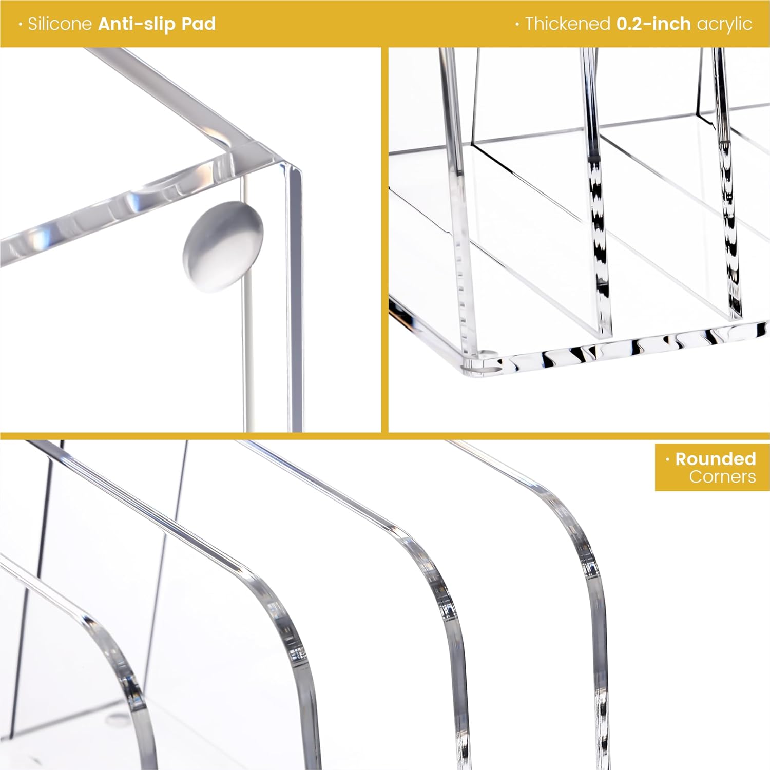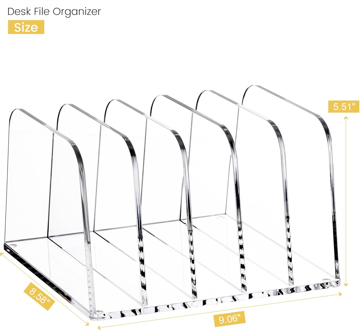 - ACRYLIC FILE HOLDER:Dimensions: 9.06" L x 8.58" W x 5.51" H, with 1.57" between each compartment. The entire desktop organizer is transparent, allowing clear visibility of books and easy retrieval. Made of crystal-clear acrylic, this vertical desk organizer fits any decor style and adds a touch of elegance to your workspace