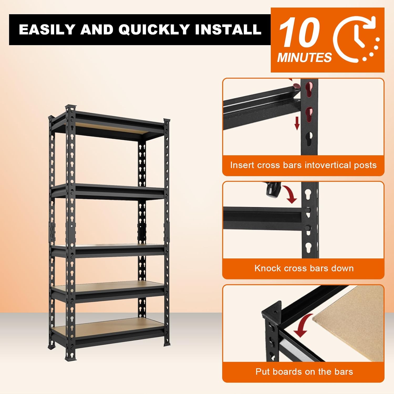 - Garage Shelving Heavy Duty Load 2000LBS: BIG RED storage shelves adopts rolled edge thickened columns, each metal shelving with support ribs. Made of high-quality metal frame+wood boards,so each shelf can hold up to 400 lbs, with a total bearing capacity of 2000 lbs, which makes 5-tier closet shelves more stable, solid and more stuff can be stored.