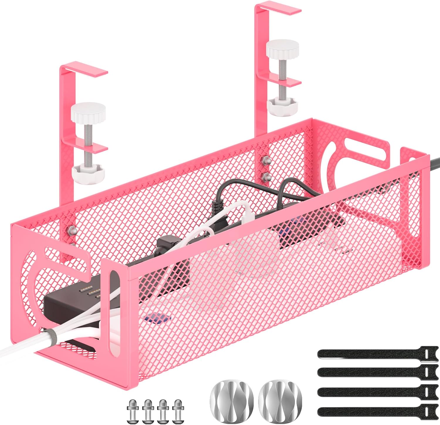 Under Desk Cable Management Tray, 15.7'' No Drill Steel Desk Cable Organizers, Wire Management Tray Cable Management Rack (1 Pack-Pink)