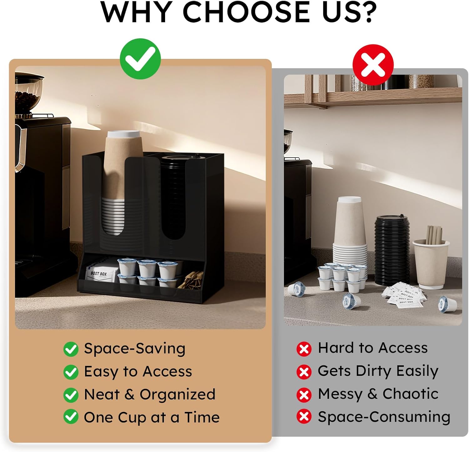 - Space-Saving & Large Capacity - We've maximized storage without hogging your counter. This compact organizer neatly holds all your essentials: 12oz to 16oz disposable cups, lids, coffee pods, sugar packets, creamers, and stirrers. It's the all-in-one solution for a clutter-free office or kitchen countertop.