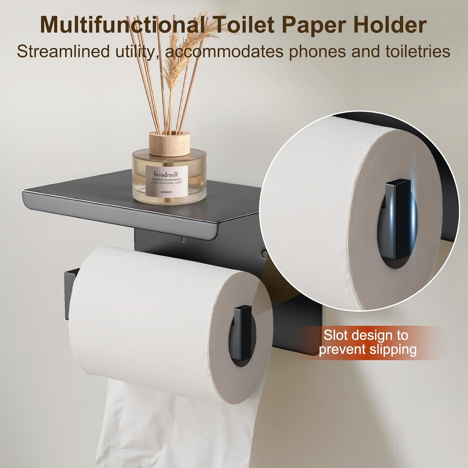 - 【Multifunctional Toilet Paper Holder】Upgraded Toilet Paper Holder features a shelf to securely store phones, aromatherapy items, or wipes. Keeps hands free while protecting toilet paper from splashes.