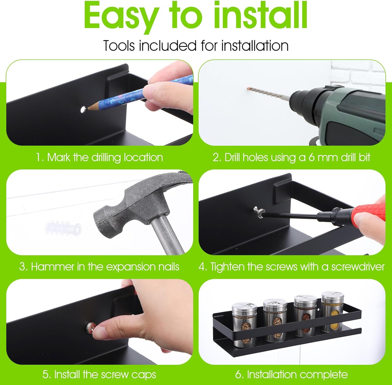 - 【Easy installation】shower caddy black comes with installation accessories, you need to drill the holes first, then drive in the plastic expansion strips, above sink shelf screw in the screws with a screwdriver (not included), install the hidden cover, and the installation is complete; wall shelves for bathroom