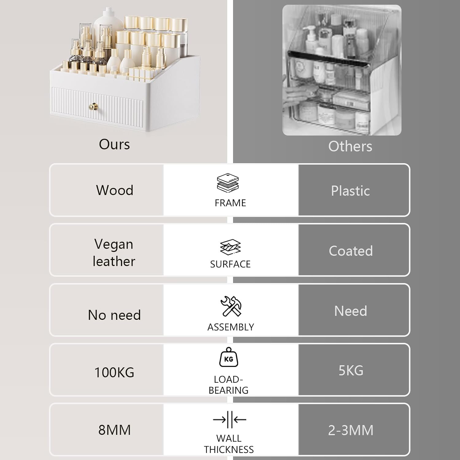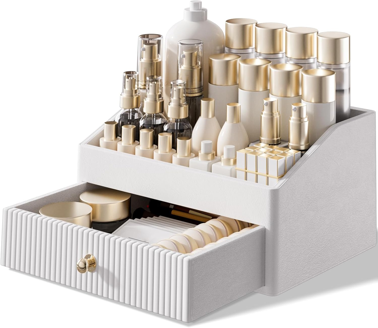 Makeup Organizer,Leather Skin Organizer with 1 Drawer&Tray,Luxury Beige White Makeup Storage for Perfume,Bedroom,Bathroom,Gifts for Women,Womens Gifts (White, 1-Drawer)