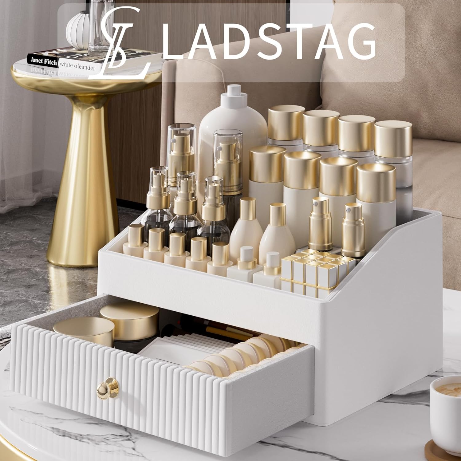 - Spacious Storage: Features one drawer and a top tray to neatly store perfumes, lipsticks, brushes, and skincare essentials. Ideal for decluttering countertops, this vanity organizer keeps beauty products organized and accessible for daily routines.