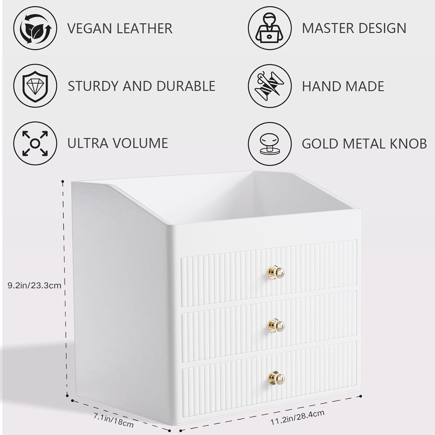 - Maximized Organization: This beige white vegan leather organizer with three drawers and a tray is perfect for storing perfume, office supplies, or jewelry, ideal for desks or vanities.