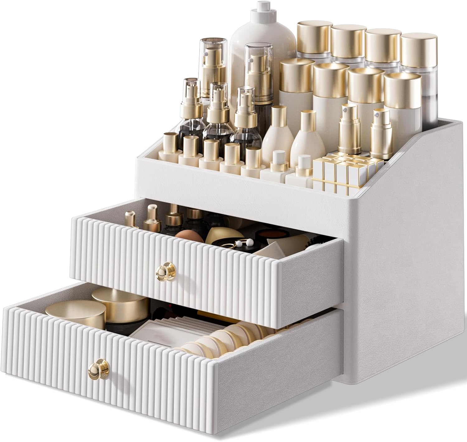 Makeup Organizer Countertop,Leather Makeup Storage with 2 Drawers,Large Capacity Beige White Make up Organizers for Counter,Bedroom,Bathroom,Birthday Gifts for Women