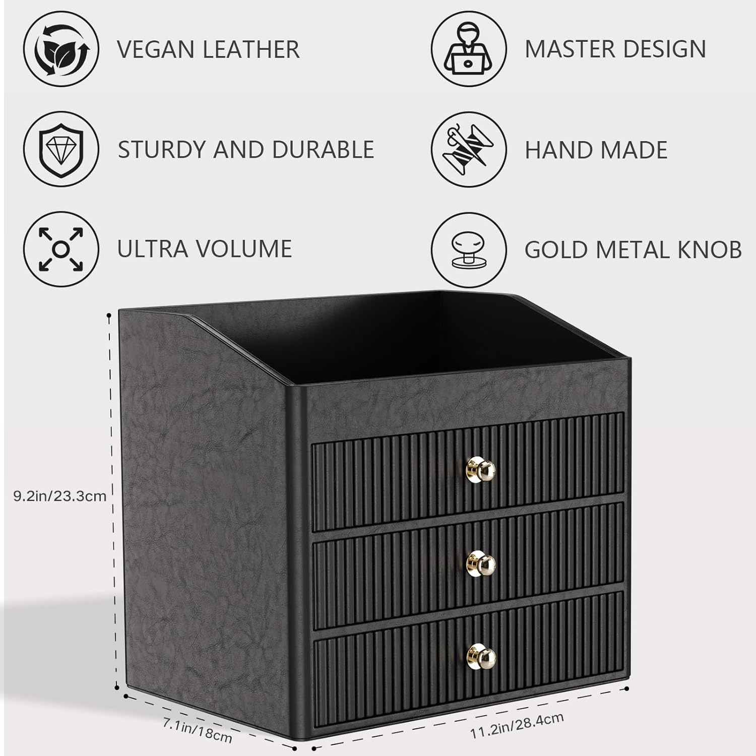 Desk Organizers and Accessories,Black Vegan Leather Desktop Organizer with 3 Drawers & Tray for Bedroom,Bathroom,Lipstick,Nail Polish,Skincare,Perfume,Jewelry Box