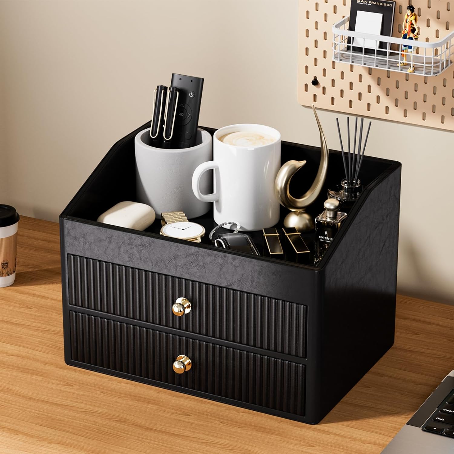 - Streamlined Storage: Organize glasses, notepads, or chargers with this black vegan leather organizer, featuring two drawers and a tray for efficient office or bedroom use.