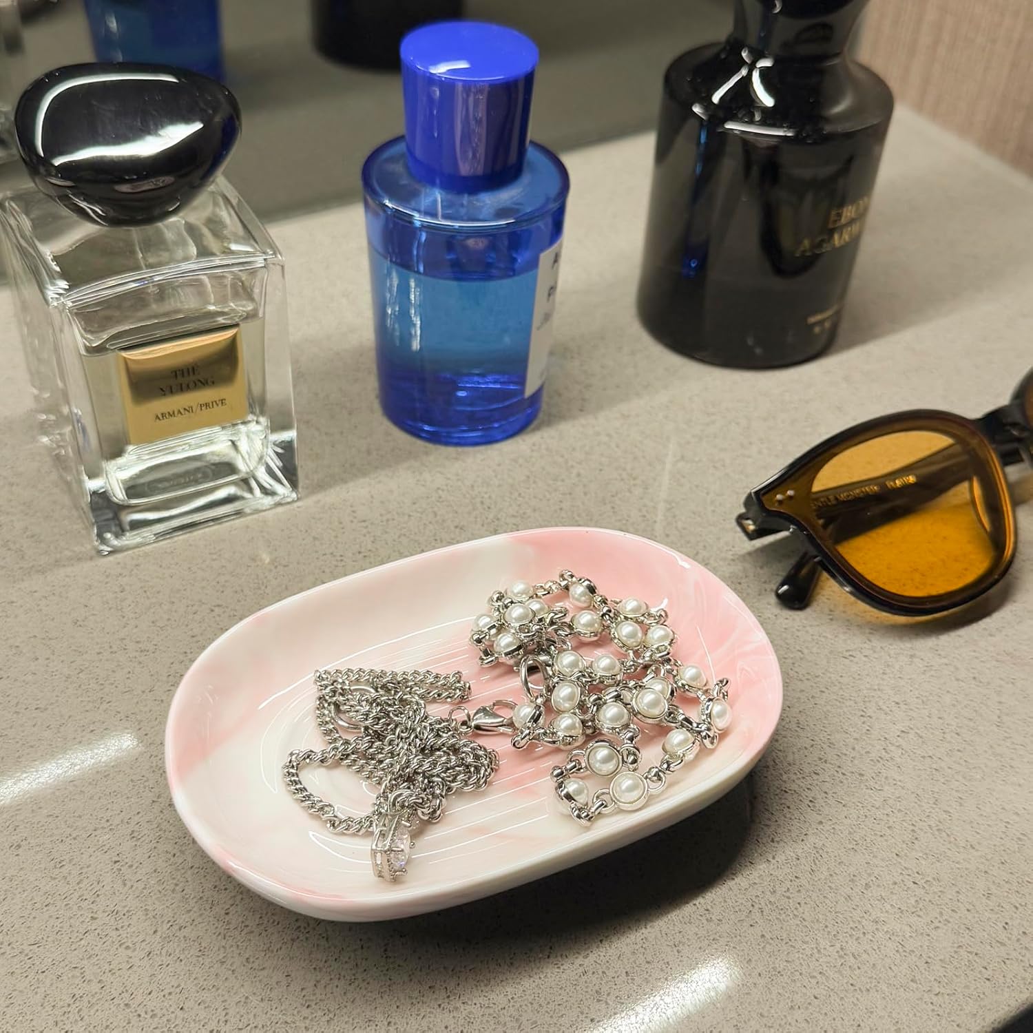 Soap Dish, Ceramic Soap Dish with Marble PatternShower, Soap Saver Tray for Bathroom, Kitchen Sink & Vanity, Multi-Use Holder for Jewelry, Rings, Keys (1 Pack, Pink-White)