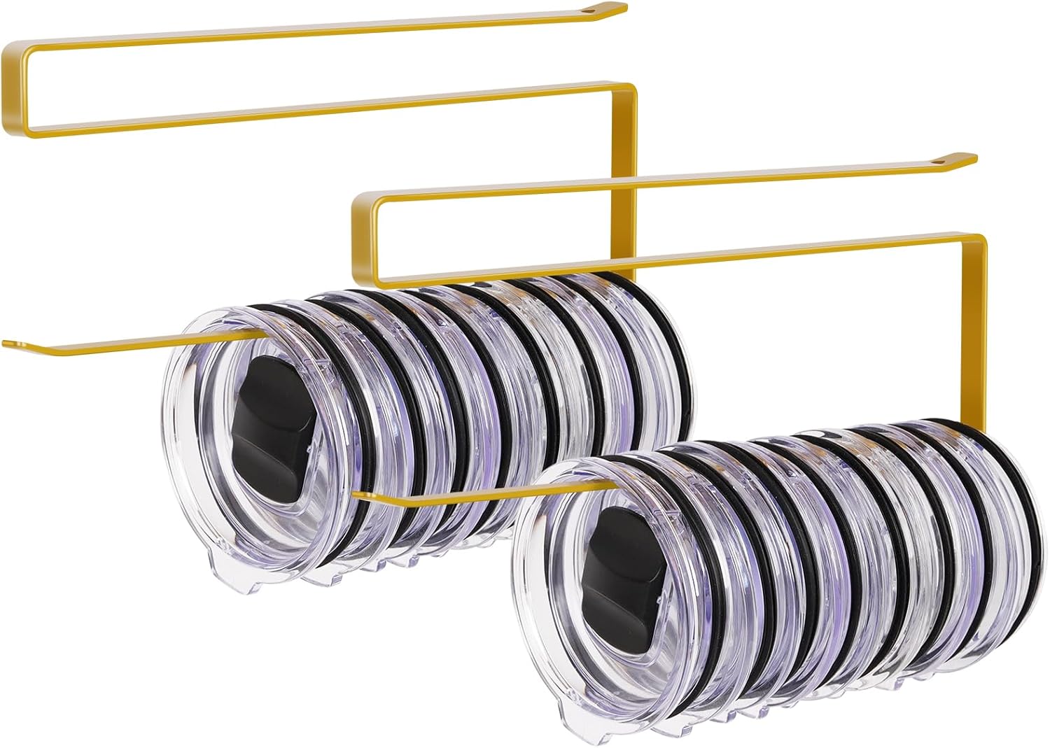 2 Pack Tumbler Lid Organizer, Horizontal Tumbler Lid Storage Hook to Hold Up 20 Lids, Space Saving Cup Lid Holders Under Cabinet Tumbler Lid Hook for Kitchen Organizer, Paper Towel Rack Hanger (Gold)