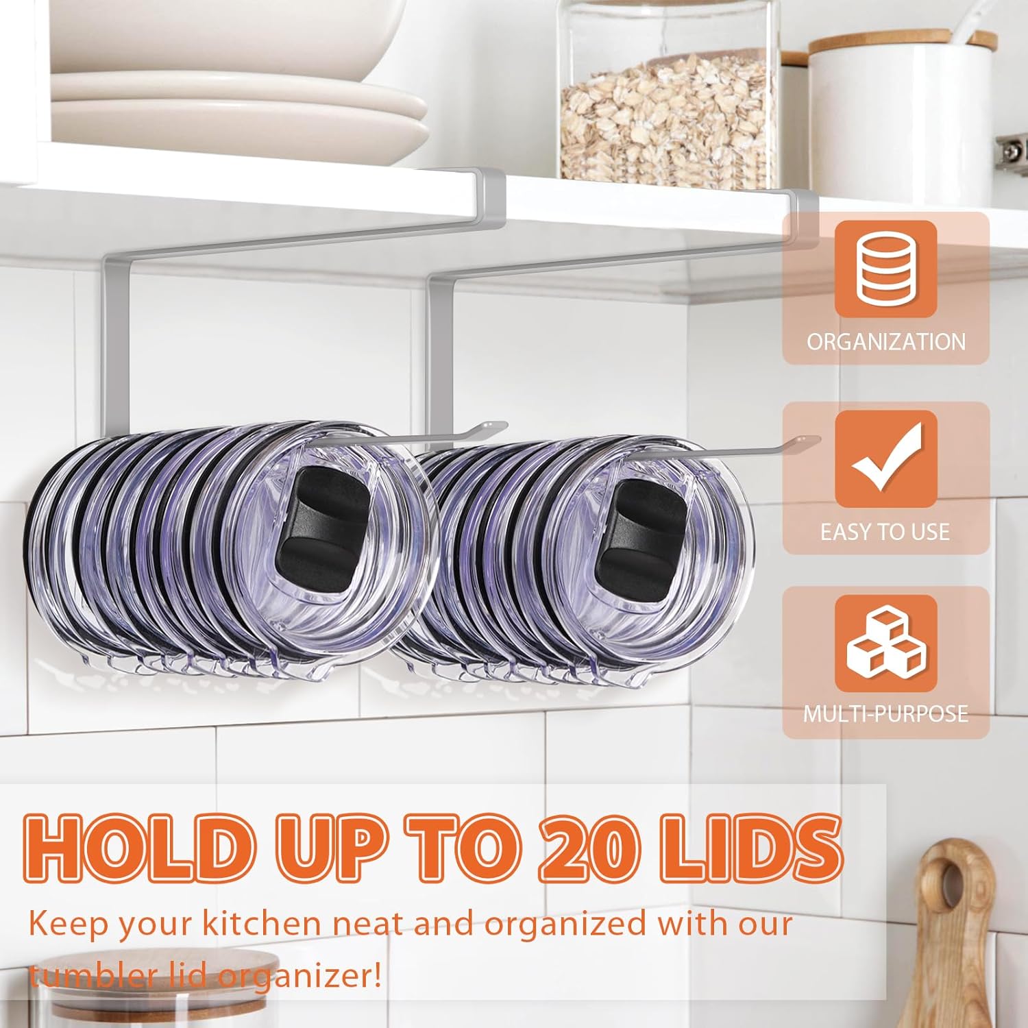 - Hold Up to 20 Lids: 2 PCS Package! Our cup lid holder storage is capable of accommodating up to 20 tumbler lids(can not store straw lids). The Tumbler lid organizer hook perfectly matches drinking tumbler lids' sizes and brands. Maximizing your need for kitchen organization space.
