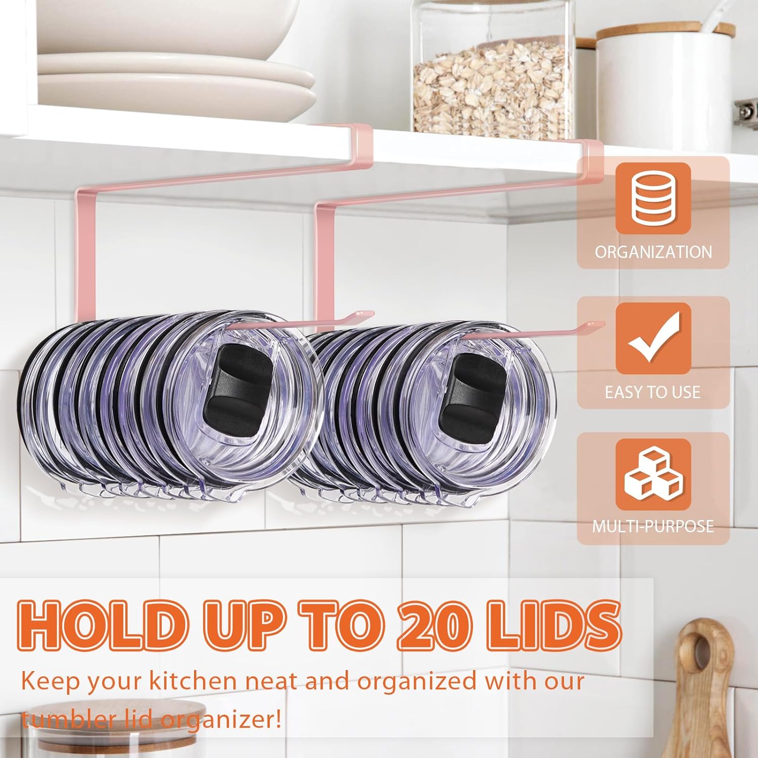 - Hold Up to 20 Lids: 2 PCS Package! Our cup lid holder storage is capable of accommodating up to 20 tumbler lids(can not store straw lids). The Tumbler lid organizer hook perfectly matches drinking tumbler lids' sizes and brands. Maximizing your need for kitchen organization space.