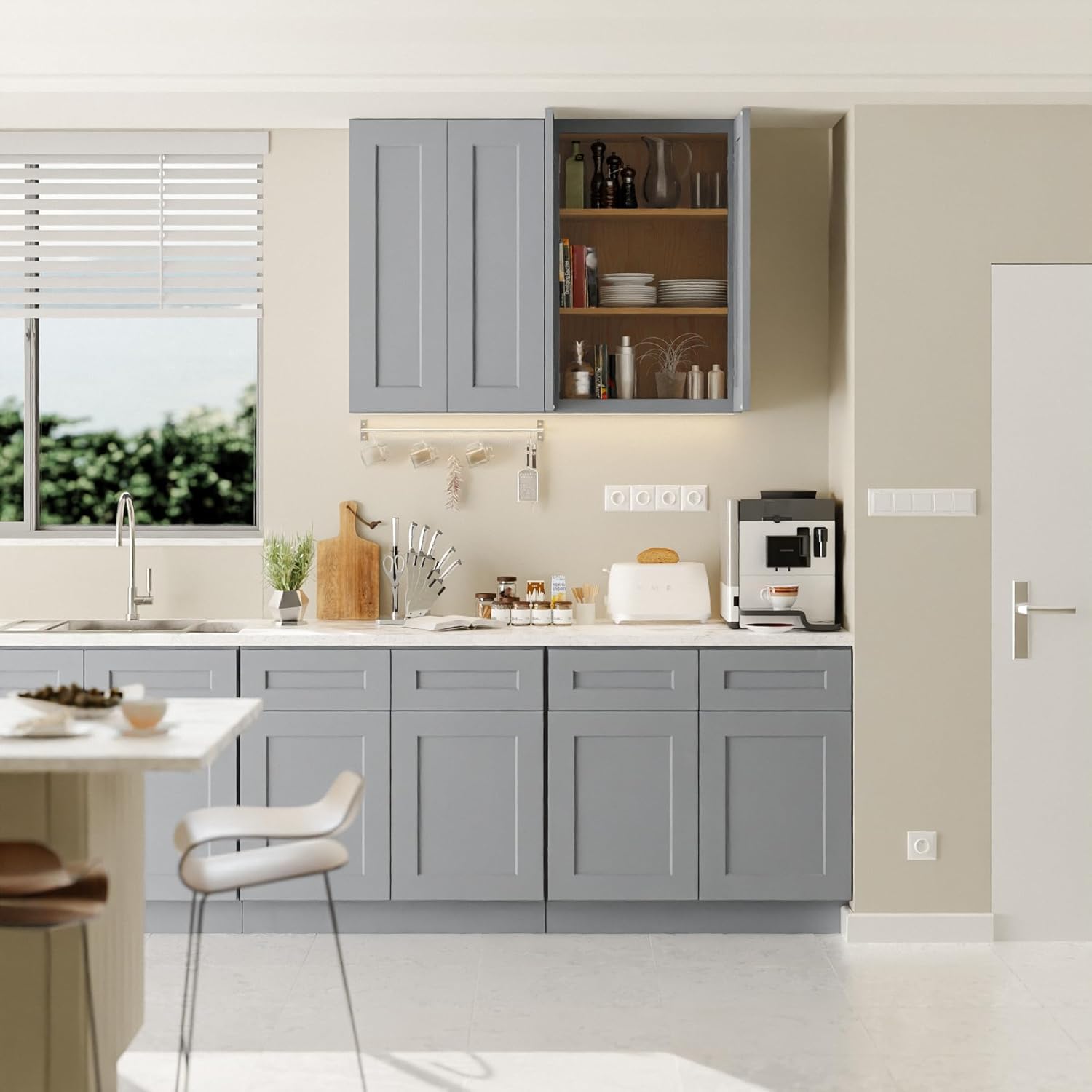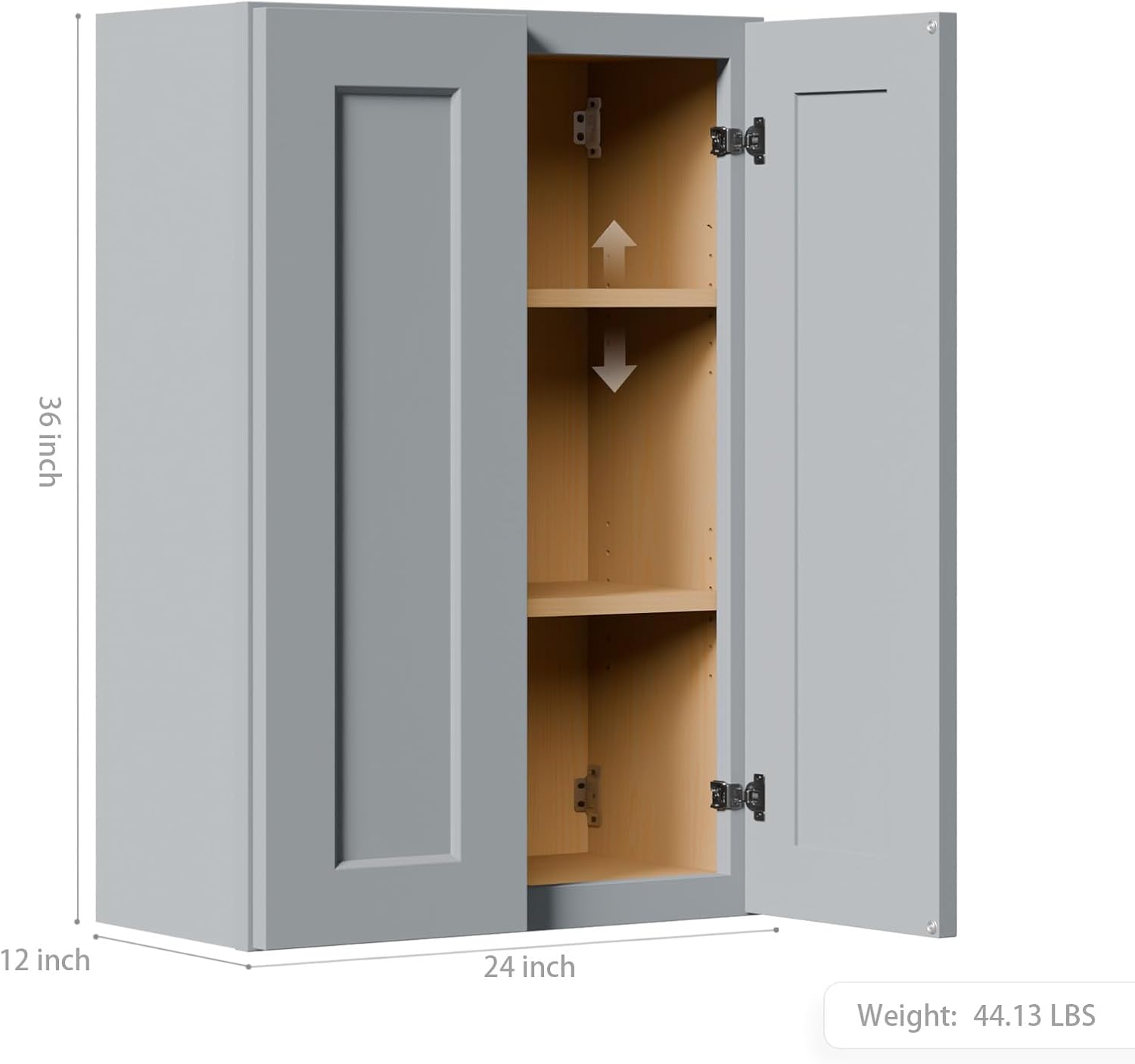 - 【VERSATILE STORAGE SPACE】 24”W×12”D×36”H bathroom medicine cabinet with 2 adjustable shelves, offering customizable storage behind 2 shaker doors.