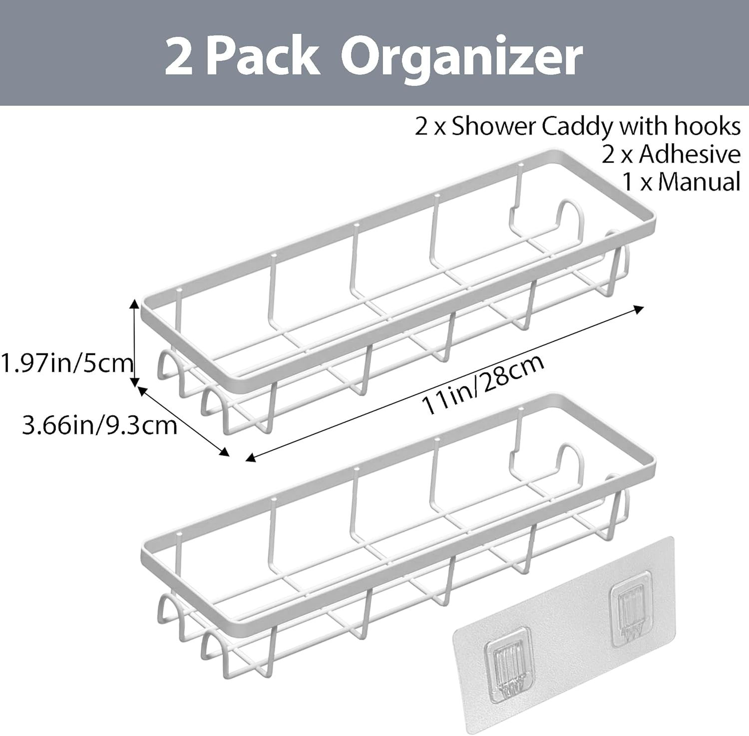 - COMPLETE SET: Package includes 2 shower caddies with hooks, adhesive strips for mounting, and instruction manual for easy installation