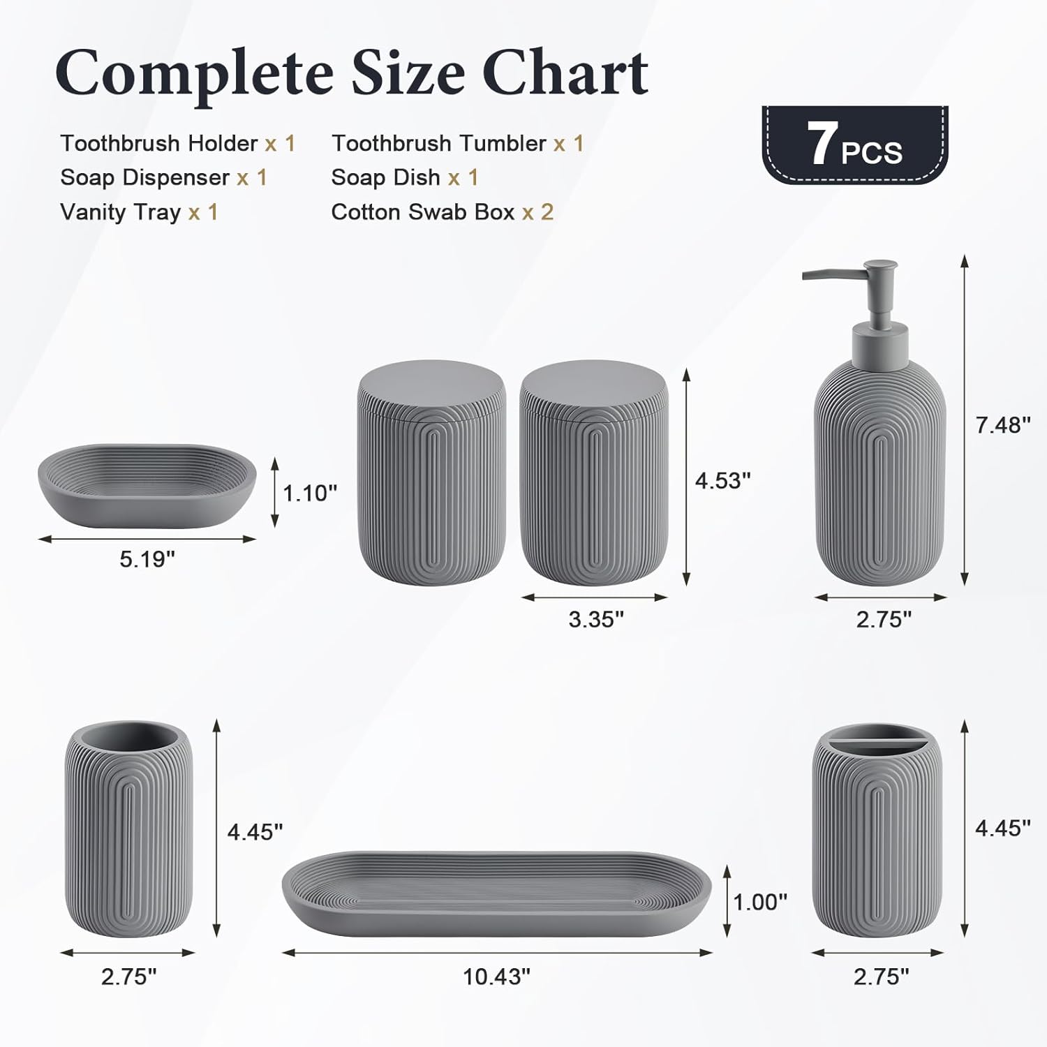 Bathroom Accessories Set - 7-Piece Resin Bathroom Set, Toothbrush Holders Set, Soap Dispenser, Qtip Holder Dispenser, Tumbler, Soap Dish & Tray, Modern Bath Decor for Home Dorm Hotel (Grey)