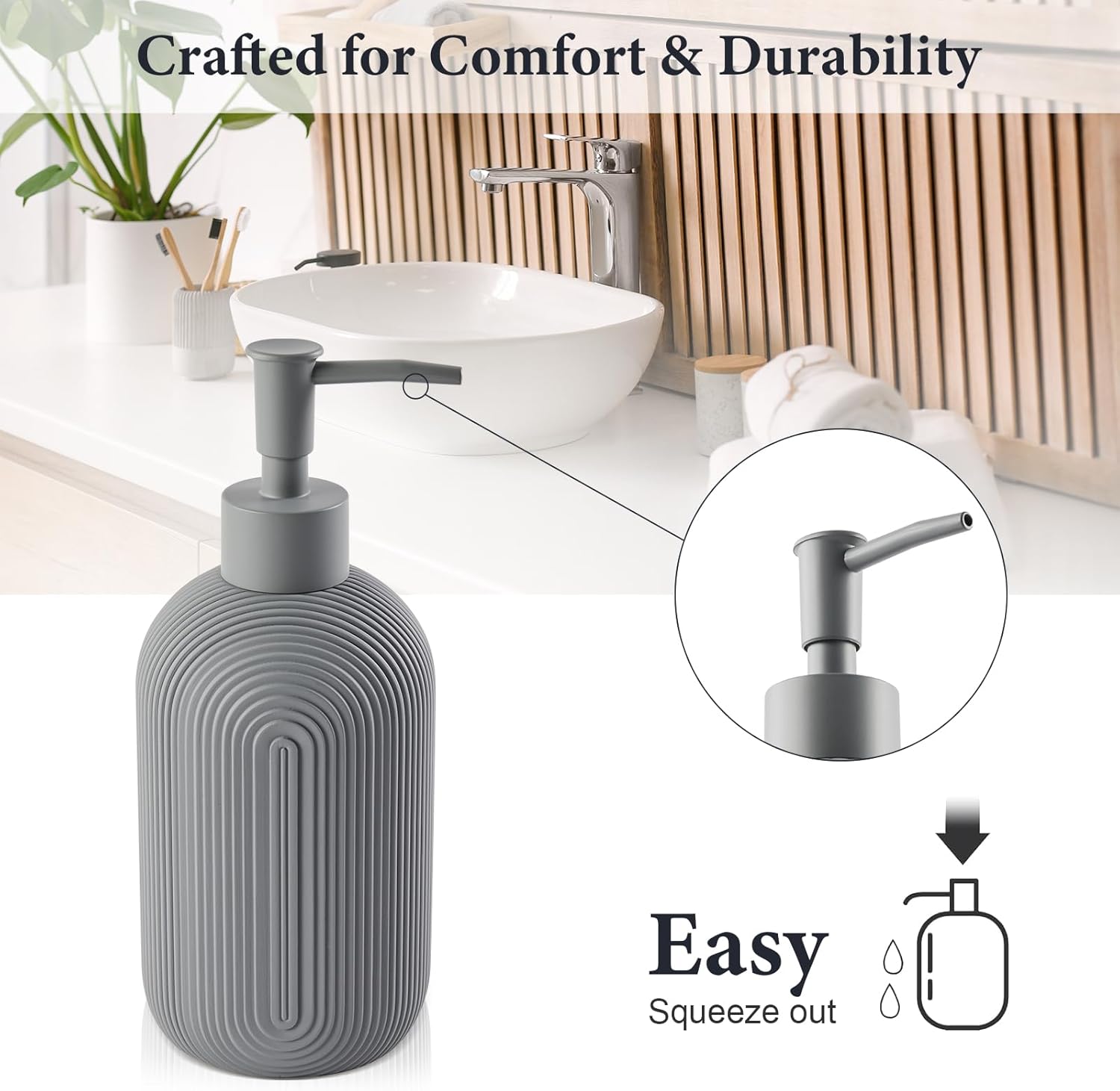 - Durable Resin Construction: Made from premium resin, the bathroom soap dispenser set feels smooth to the touch and is highly sturdy, able to withstand daily use. The soap dispenser pump features a stainless steel coating for smooth, rust-resistant operation. The resin is waterproof, stain-resistant, and won’t fade or warp, making it ideal for humid bathrooms. Compared to regular plastic, it feels more premium, sturdy, and reliable.