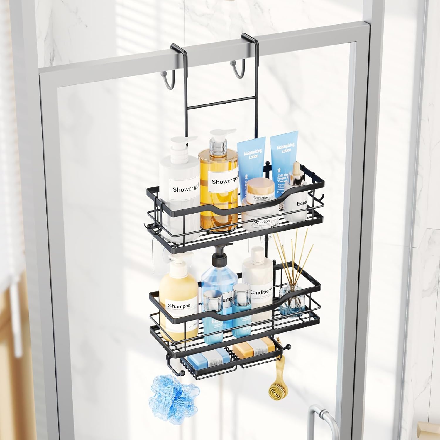 - [Tool-Free Installation]: The over door shower organizer can be hung directly over your shower door—no drilling required. With included adhesive pads and hook shower caddy design, the over the door shower caddy hanging stays securely in place, saving you time and effort during installation