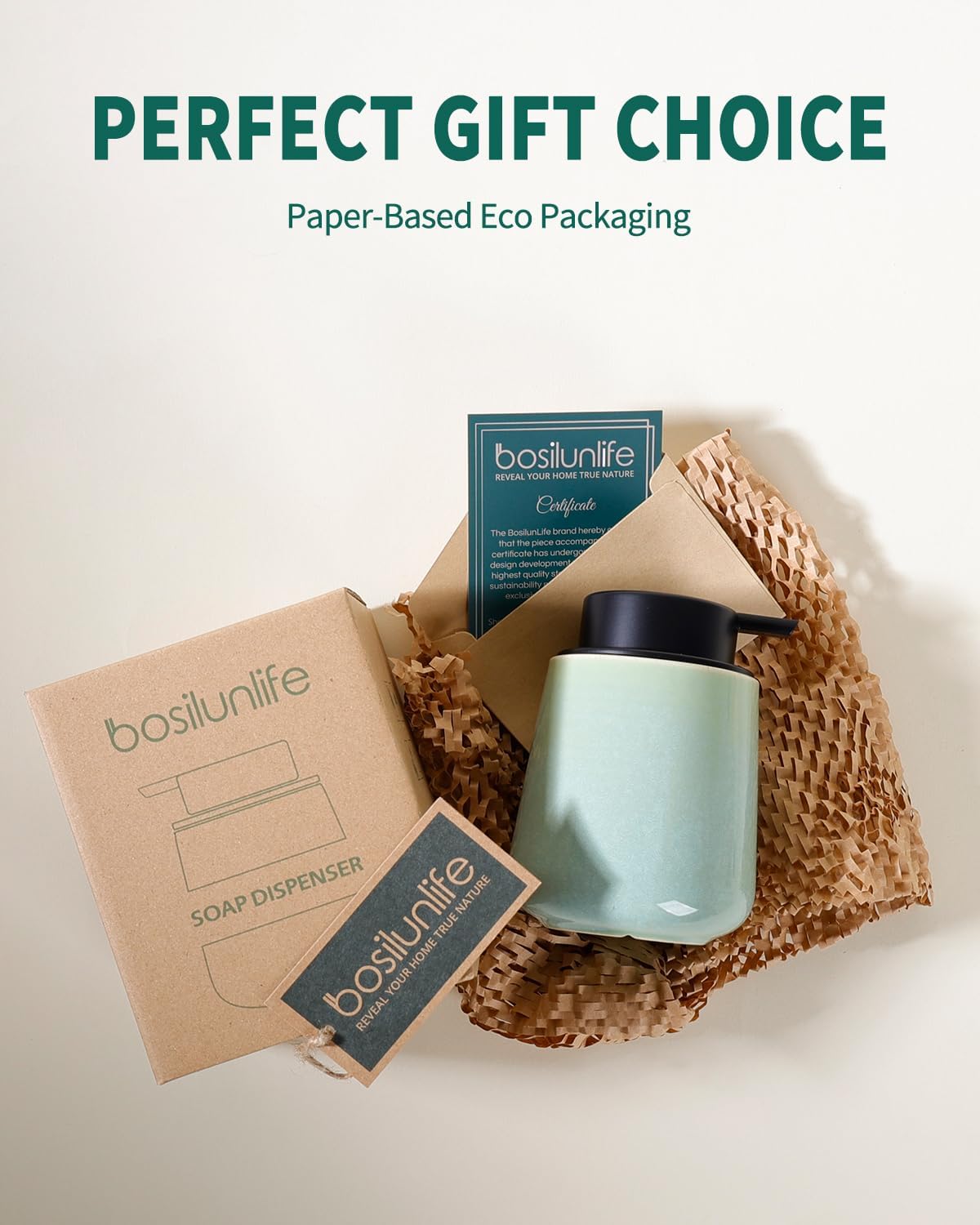 BosilunLife Foam Hand Soap Dispenser - 12 oz Bathroom Lotion Hand Pump Dispenser Light Green Foaming Soap Dispenser Ceramic Dish Liquid Dispenser for Kitchen